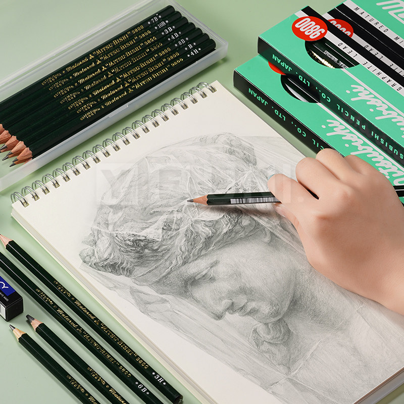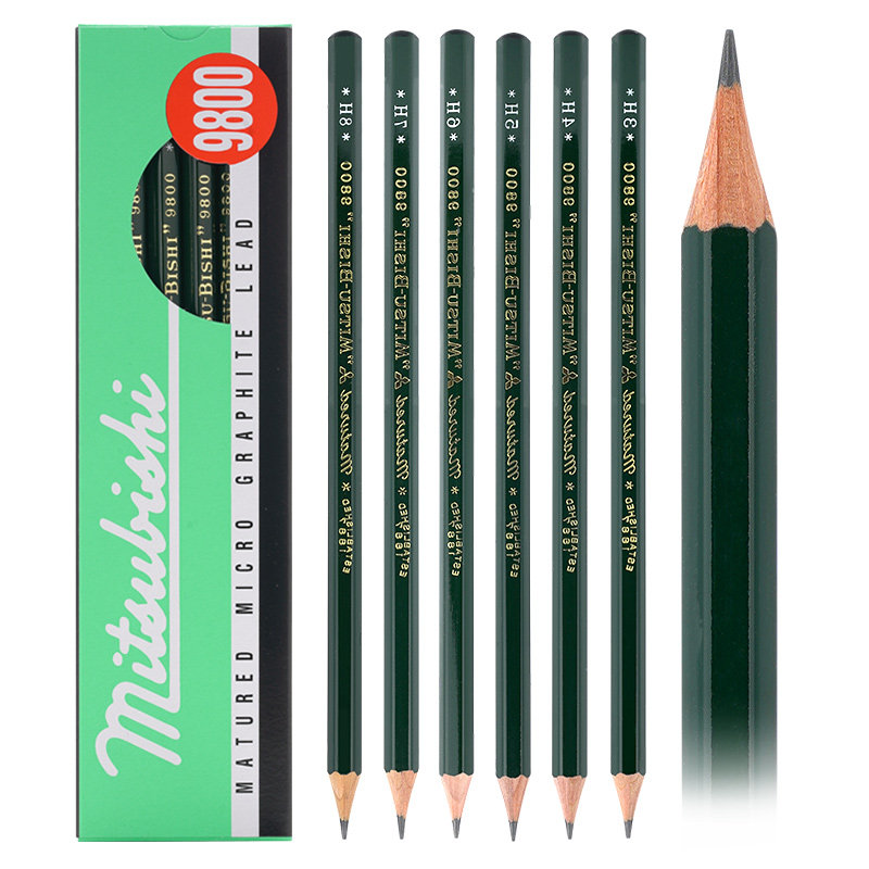日本uni三菱9800铅笔盒装mitsubishi绘画专业美术专用2比书写2B/HB/2H/4b全套装炭笔木质头学生素描原装进口