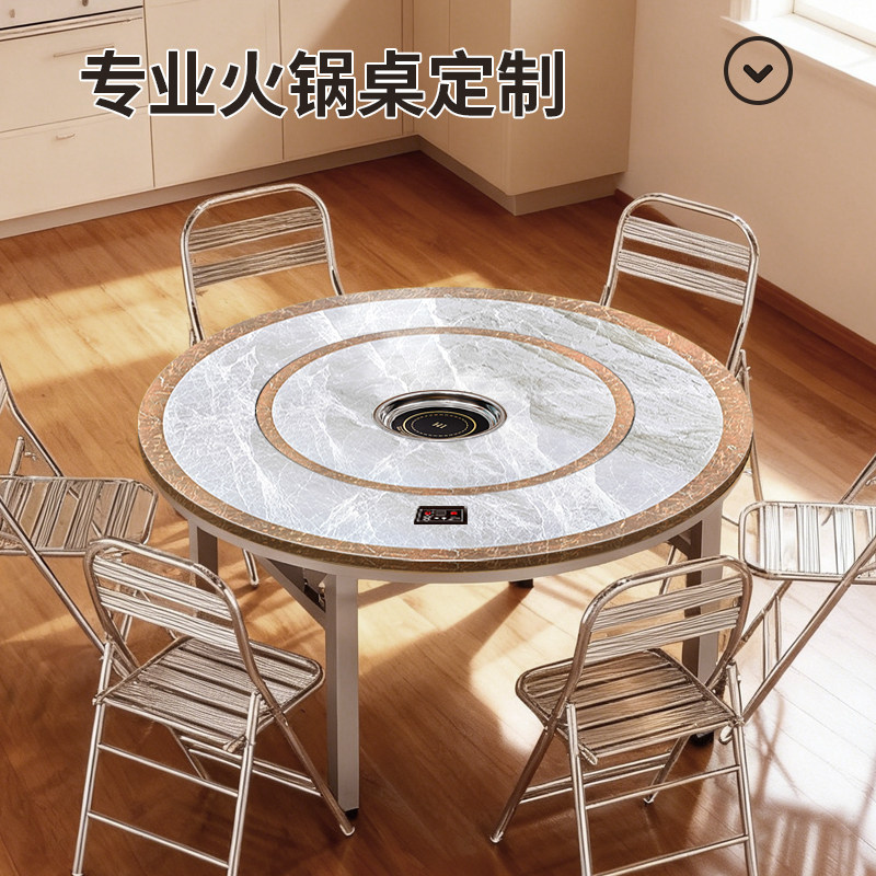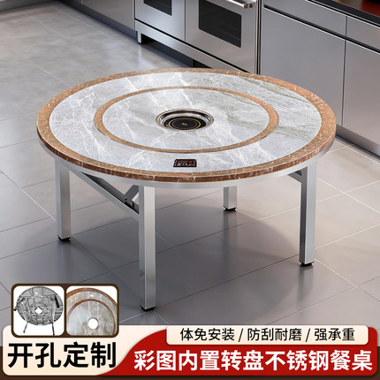 加厚304不锈钢可折叠火锅桌电磁炉彩图圆桌家用商用餐桌转盘桌子