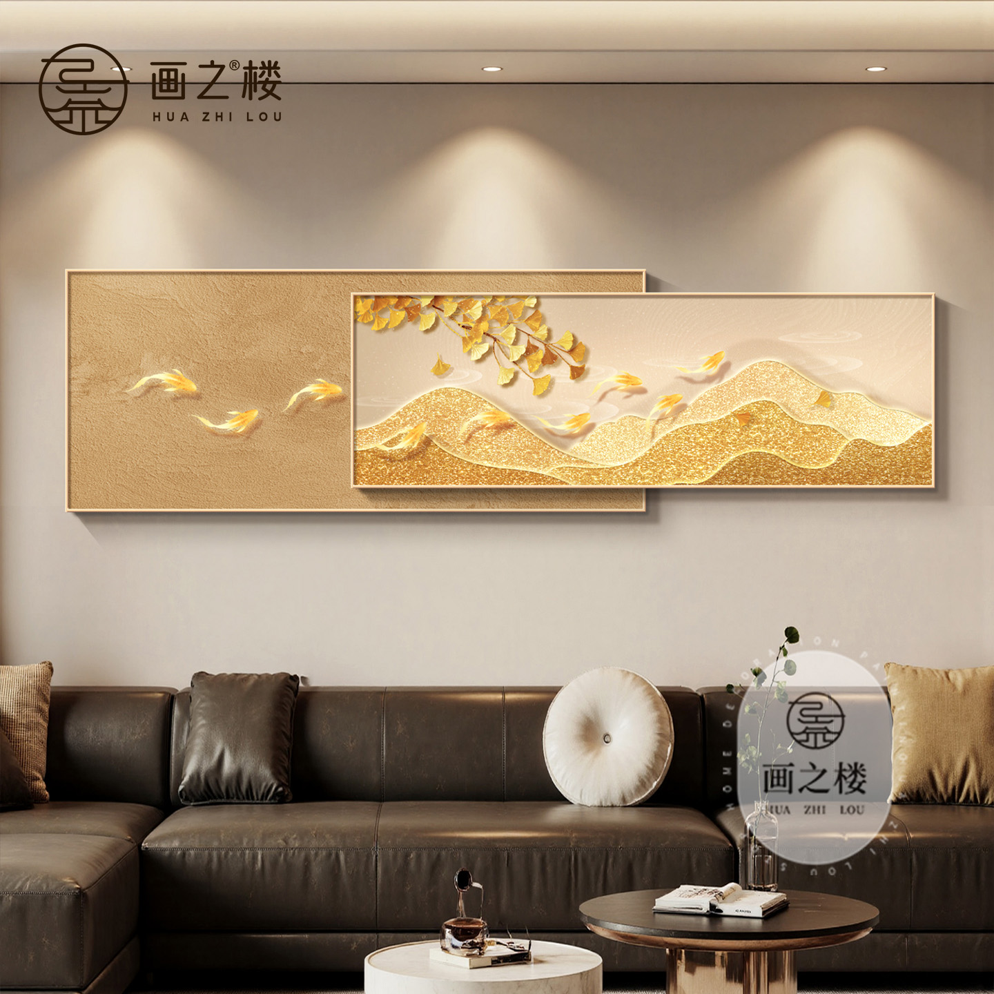 现代轻奢客厅挂画金色银杏叶沙发背景墙装饰画简约高级感横版壁画