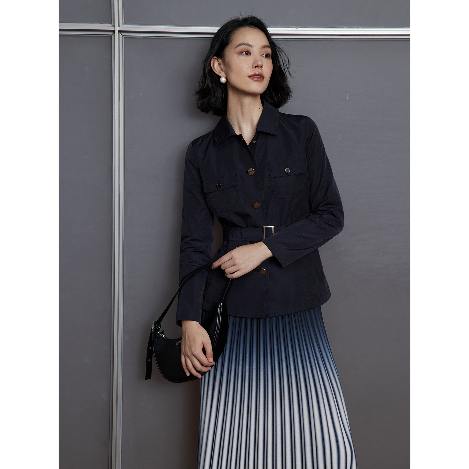 【断码清仓5折】小方领显瘦藏青色通勤单排扣束腰风衣防风外套女