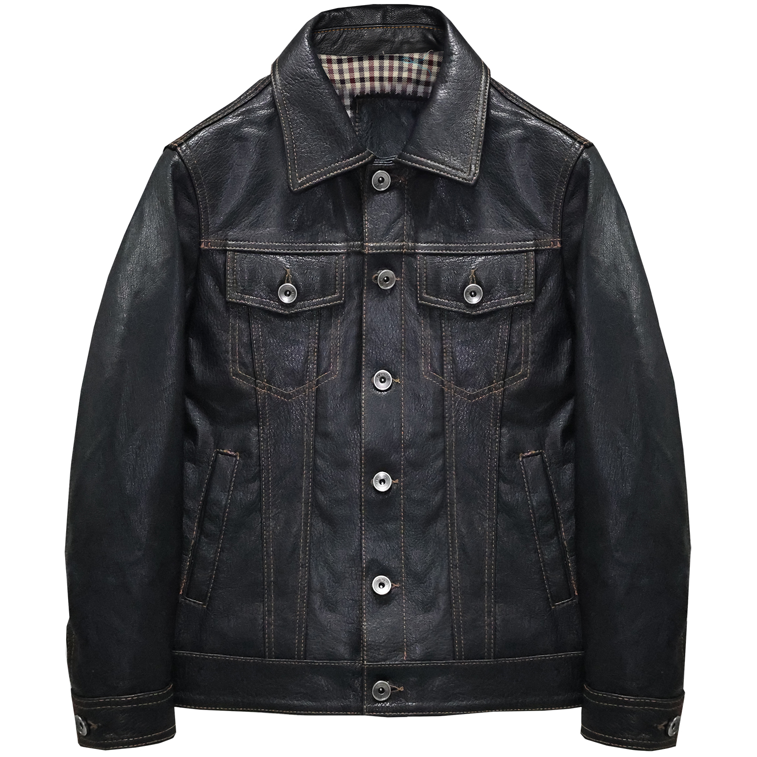 头层山羊真皮皮衣男女修身短款青年翻领简约休闲牛仔夹克外套么