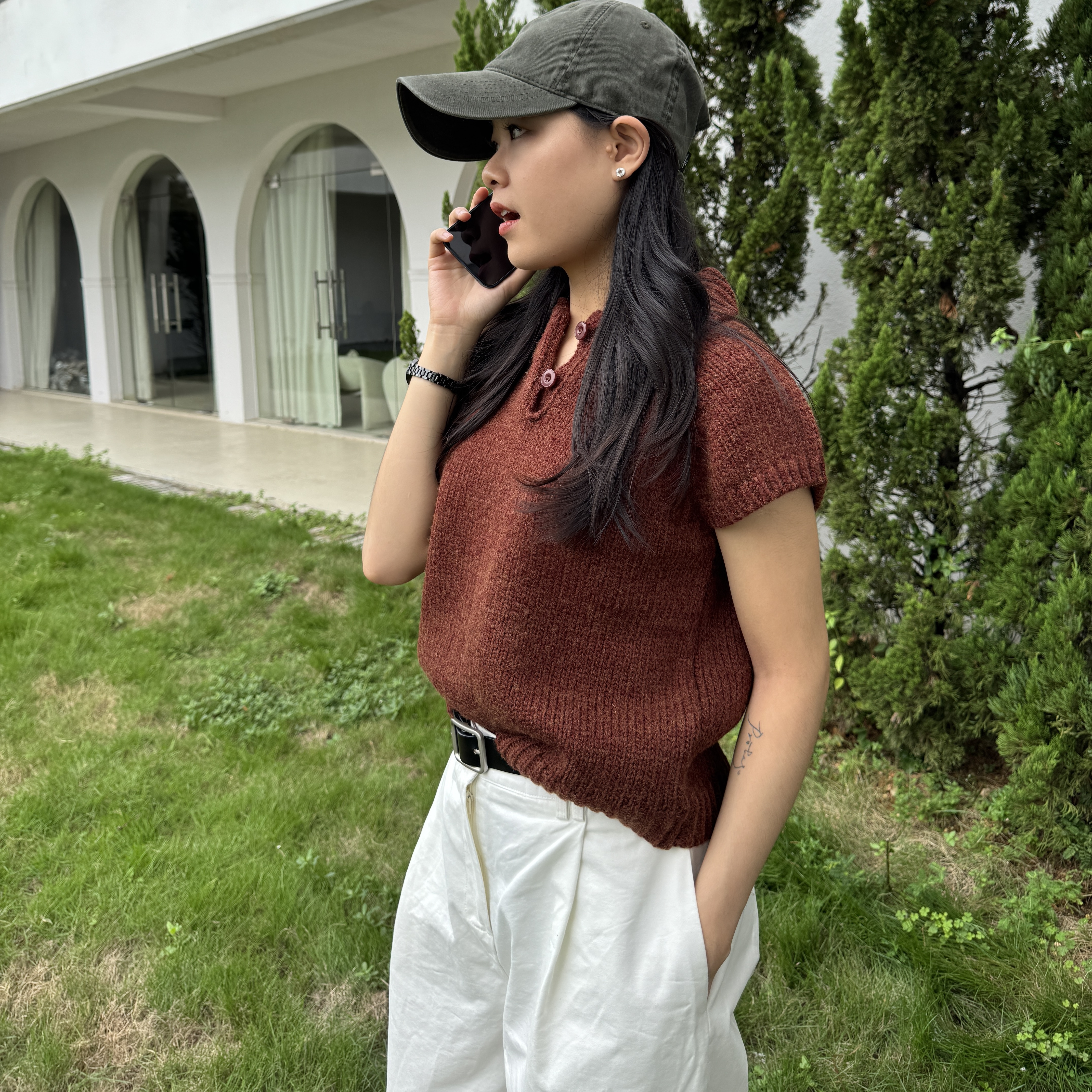 包邮CHUANHUI秋季女装25 短袖毛衣针织上衣翻领套头短款粗针毛衣