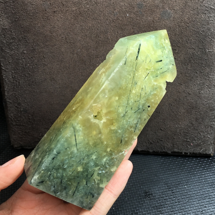天然葡萄石柱子原石打磨单尖四棱柱绿发晶玛瑙洞家居装饰品摆件