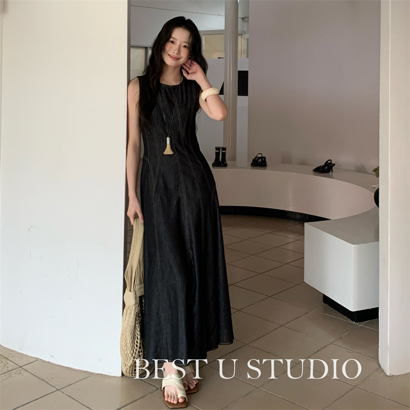 TCCW复古不规则拼接显瘦无袖牛仔连衣裙女夏季新款Best U气质长裙