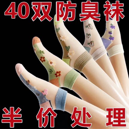 夏天冰丝袜子女短筒水晶袜玻璃丝短袜绣花卡丝船袜超薄透气防勾丝