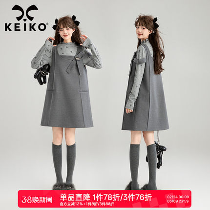 凯莉欧蝴蝶结饰格雷系毛呢背带裙