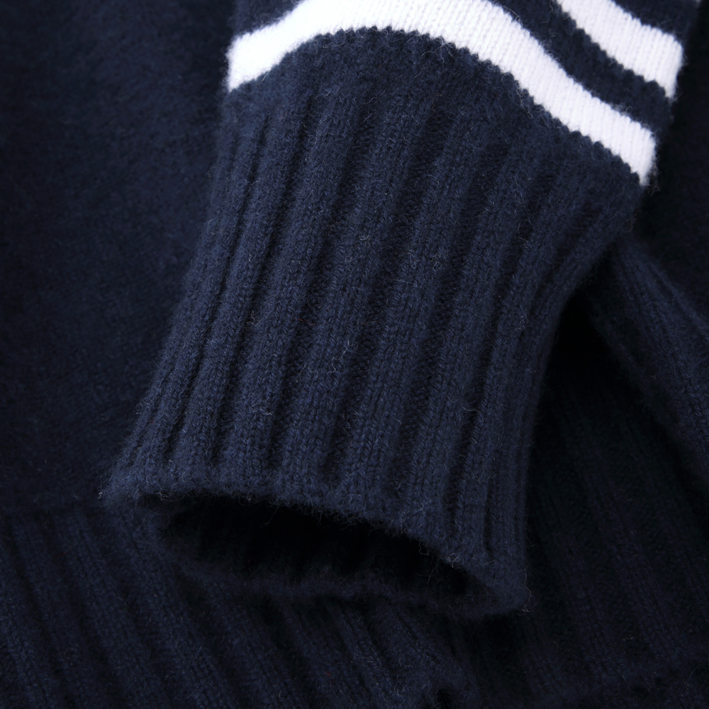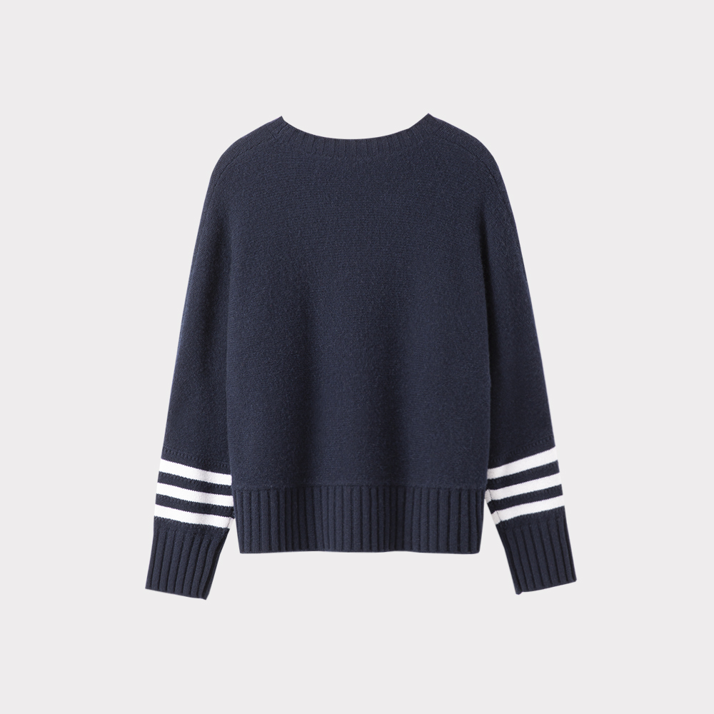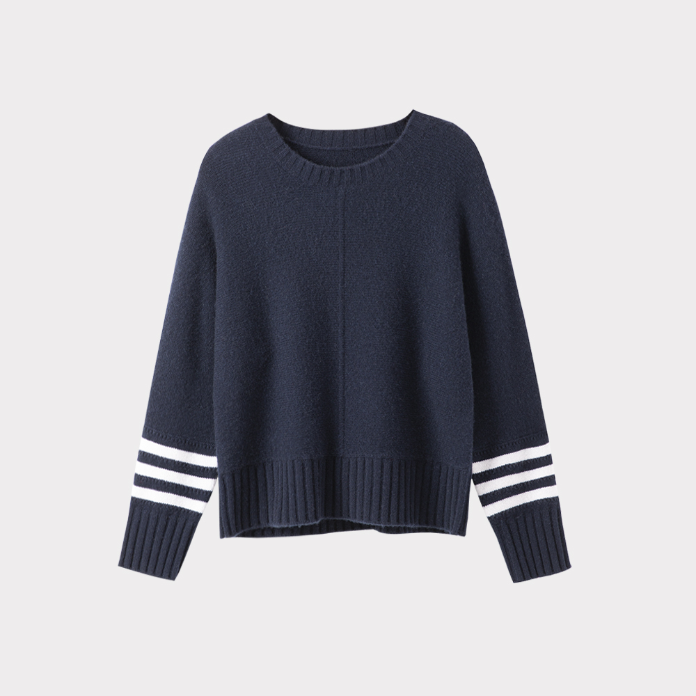 通勤百搭!创意条纹拼色羊绒衫女圆领套头纯羊绒毛衣宽松小蝙蝠袖