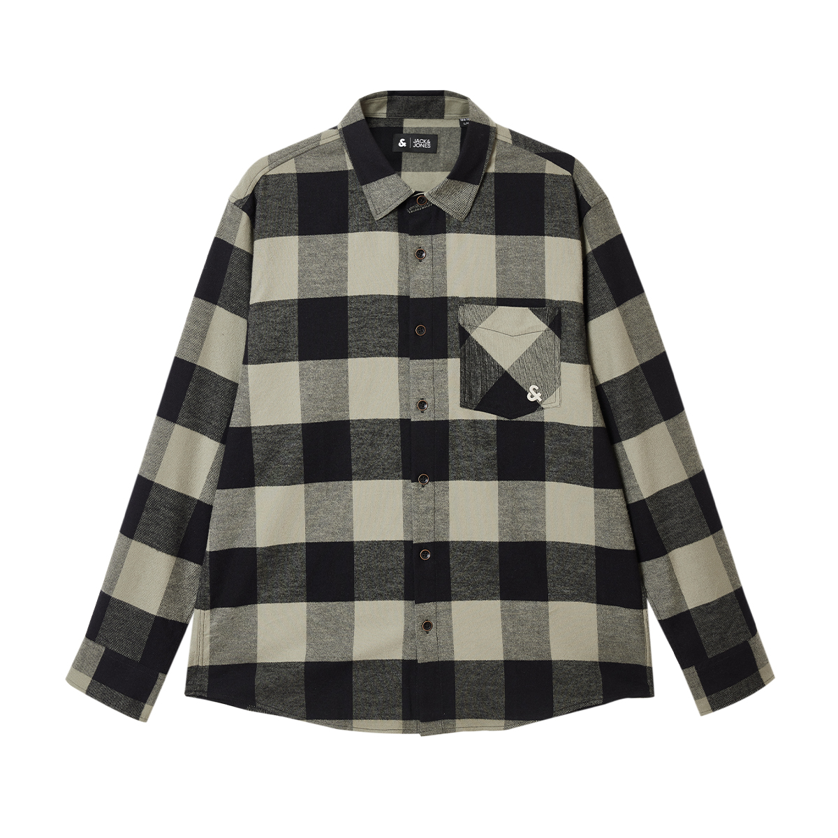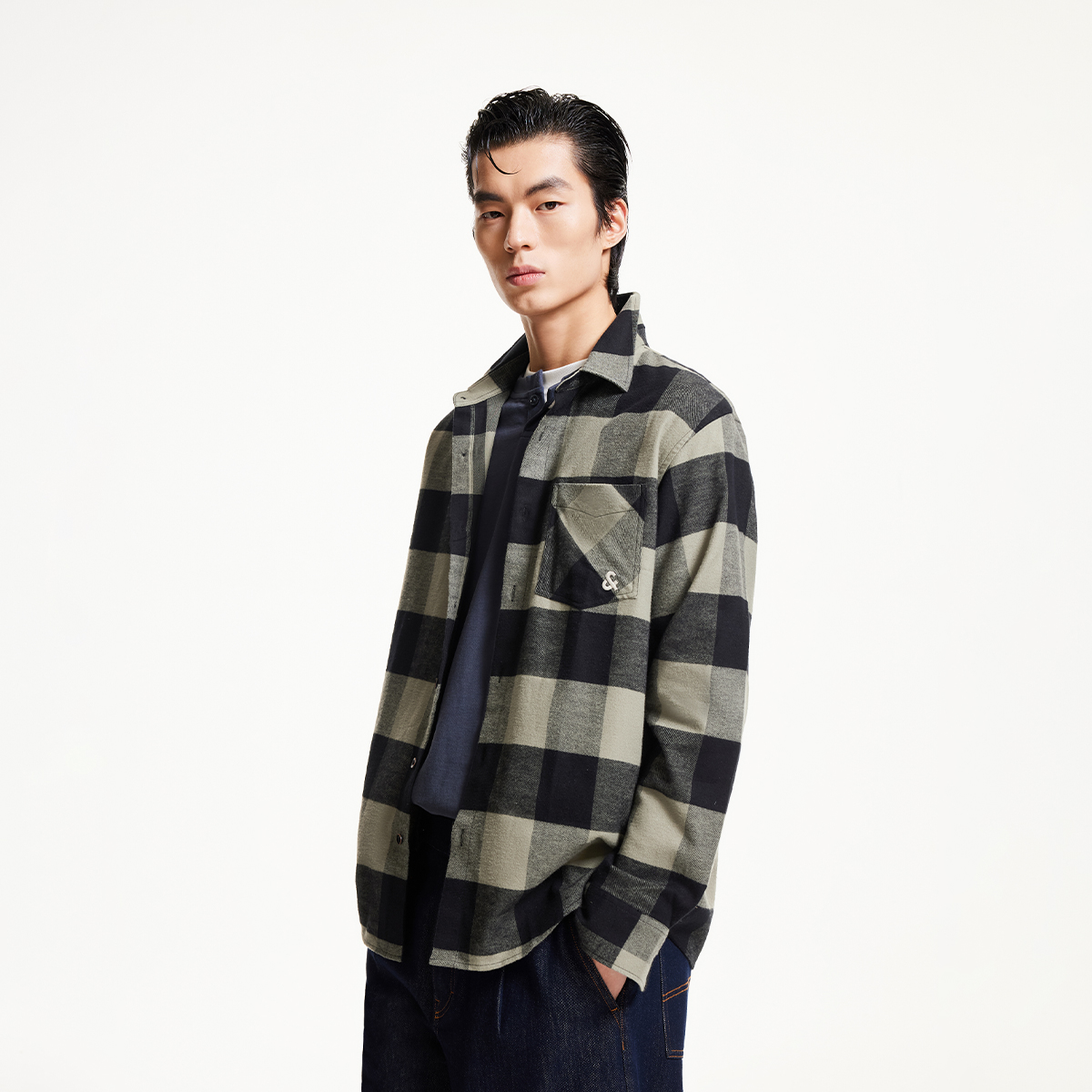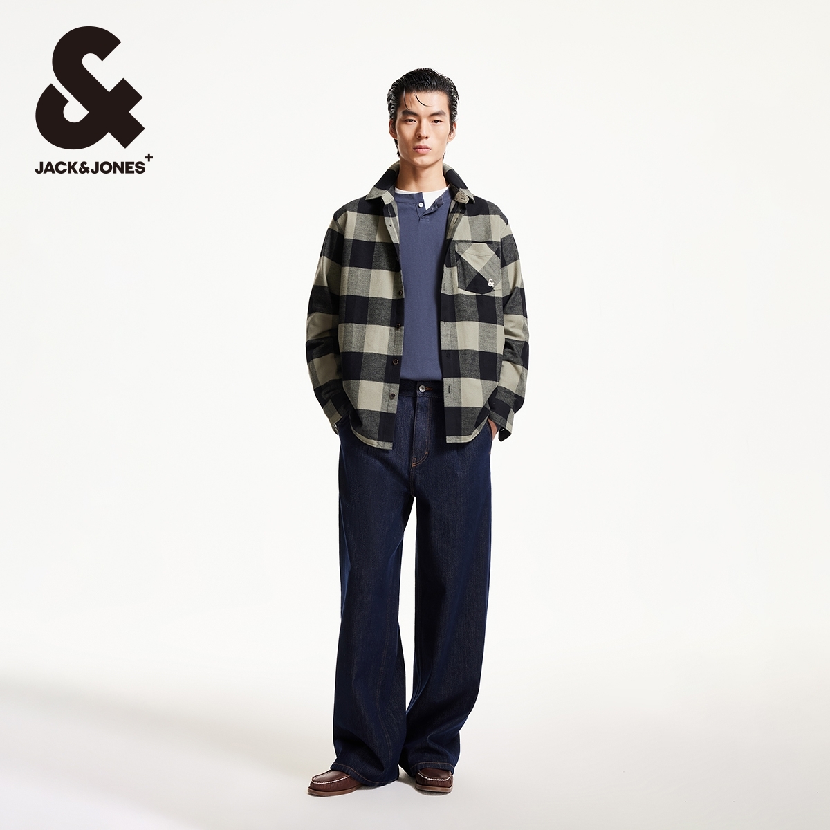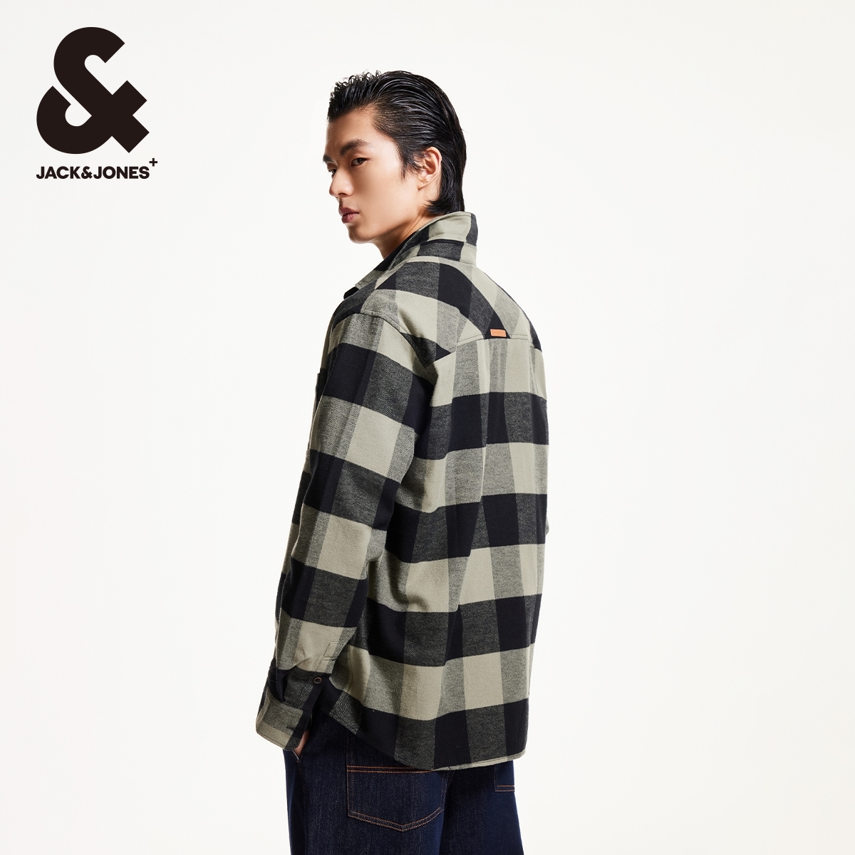 jq区绫致杰克琼斯潮百搭时尚尖领刺绣贴袋口袋撞色格纹磨毛男衬衫