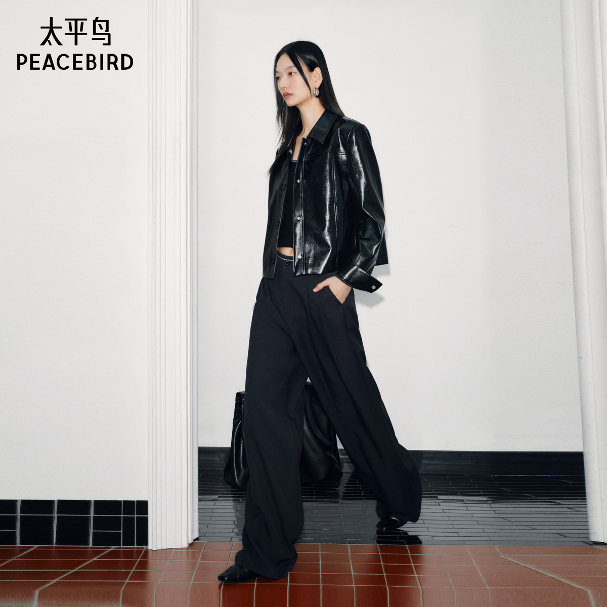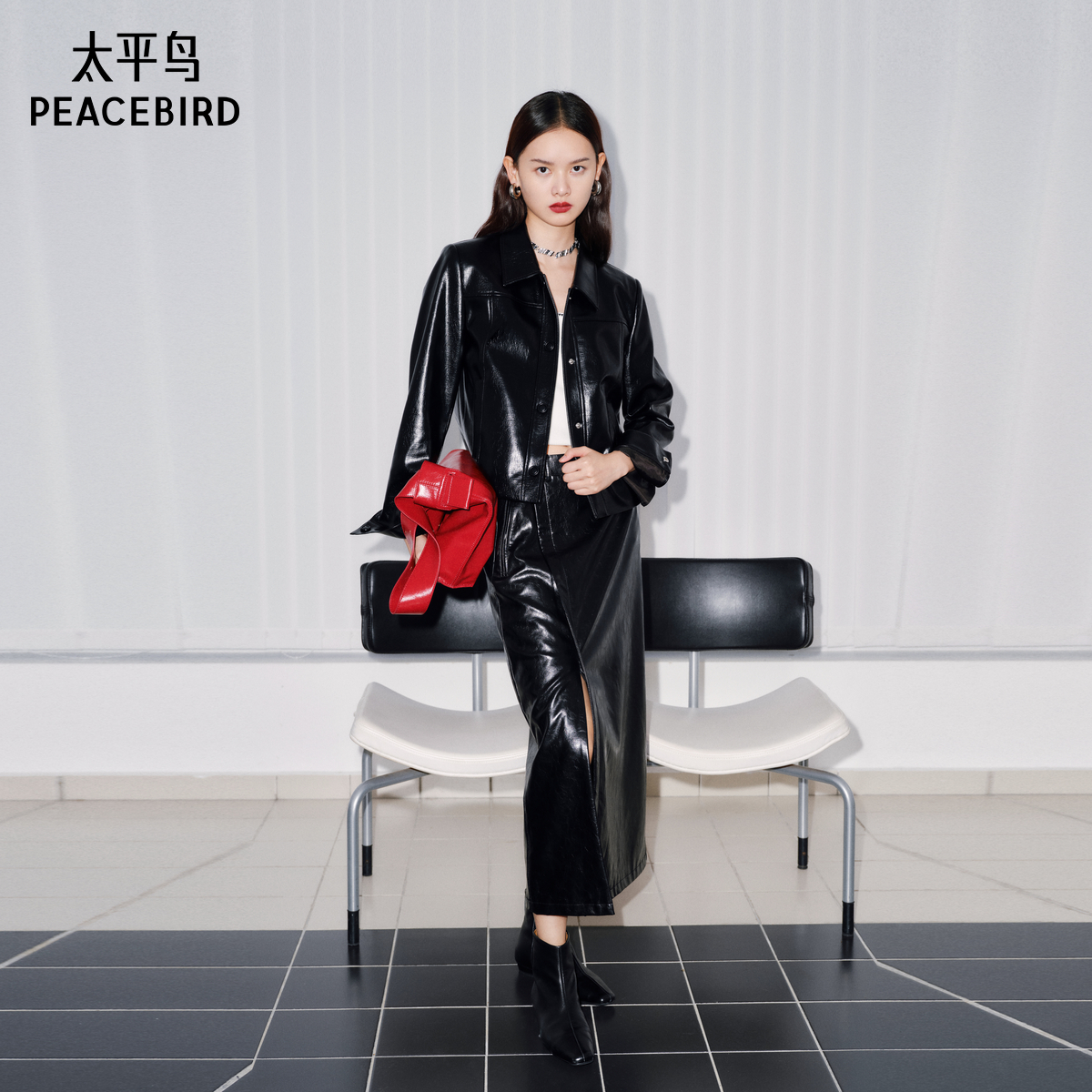 太平鸟PU油蜡皮衣外套女25春装新款黑色时尚高级感翻领夹克外套