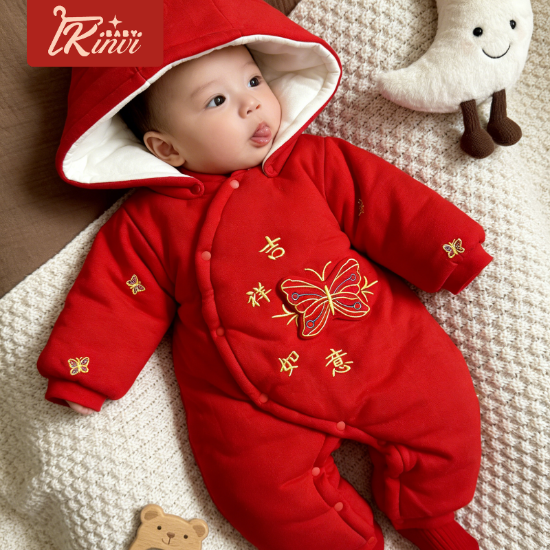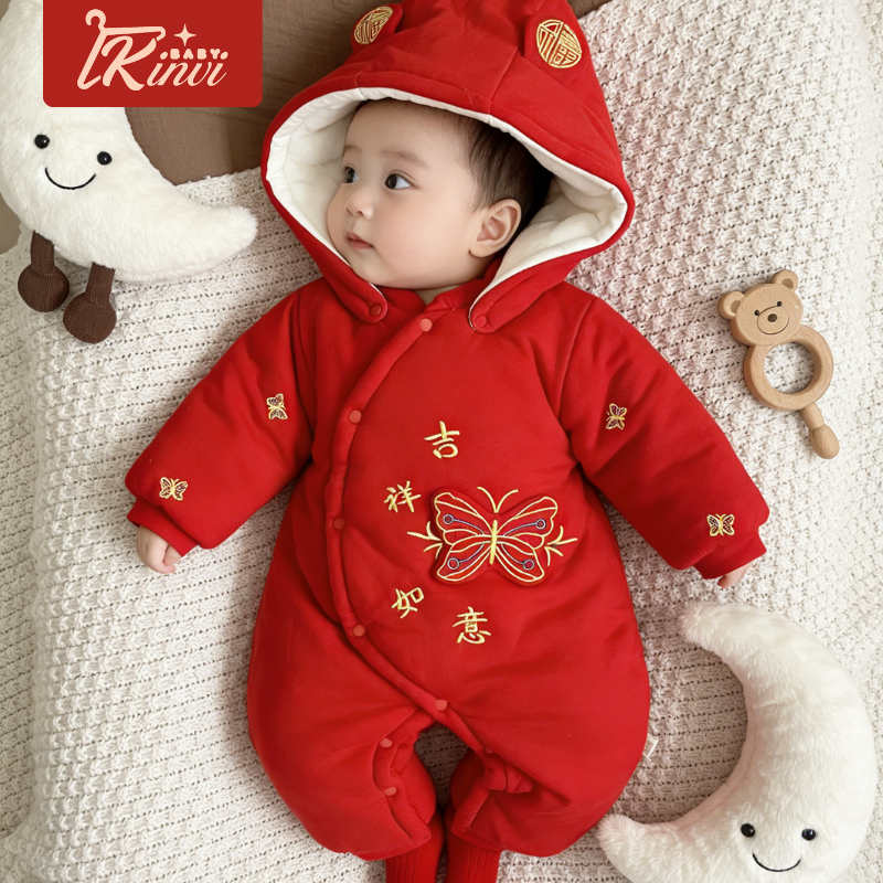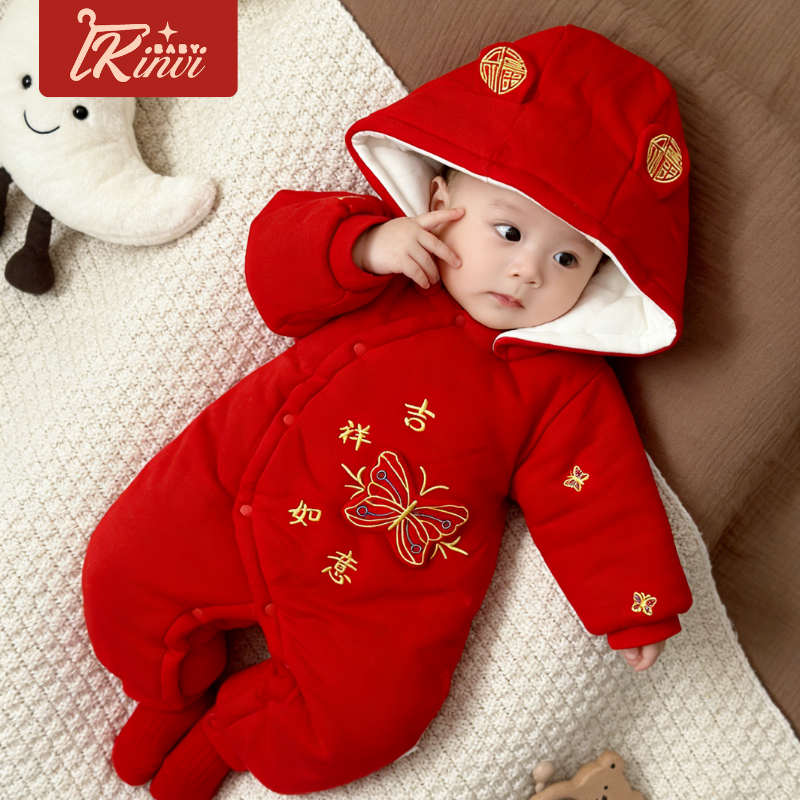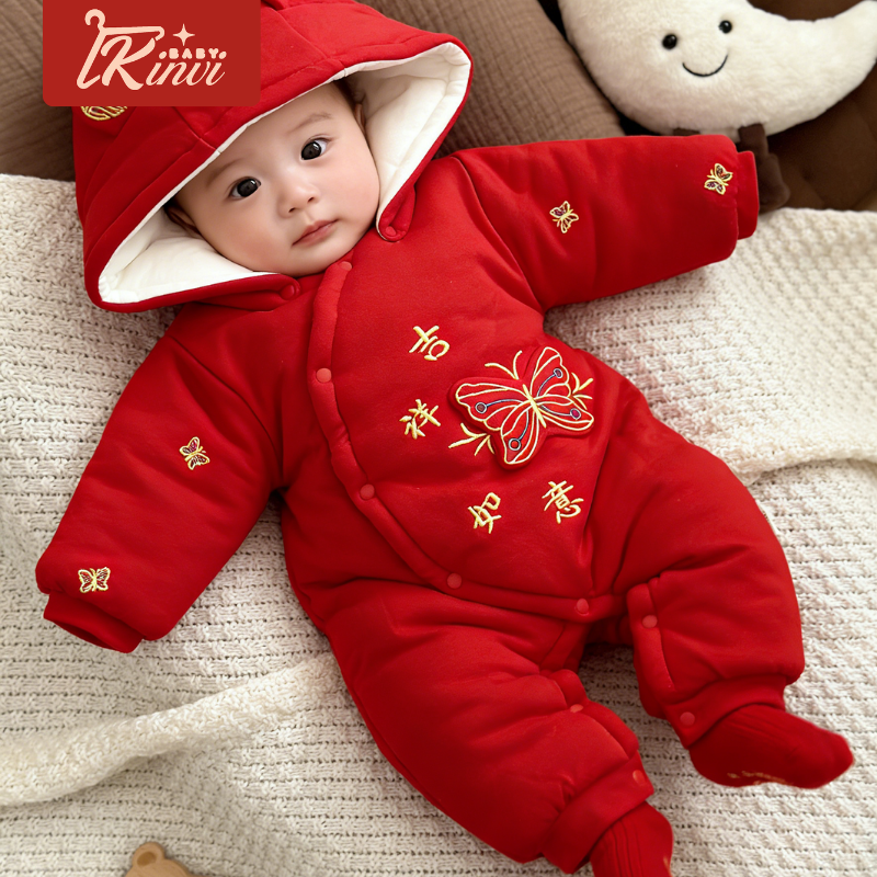 加厚冬季300克红色连体衣保暖夹棉新生婴儿喜庆满月宝宝衣服男女