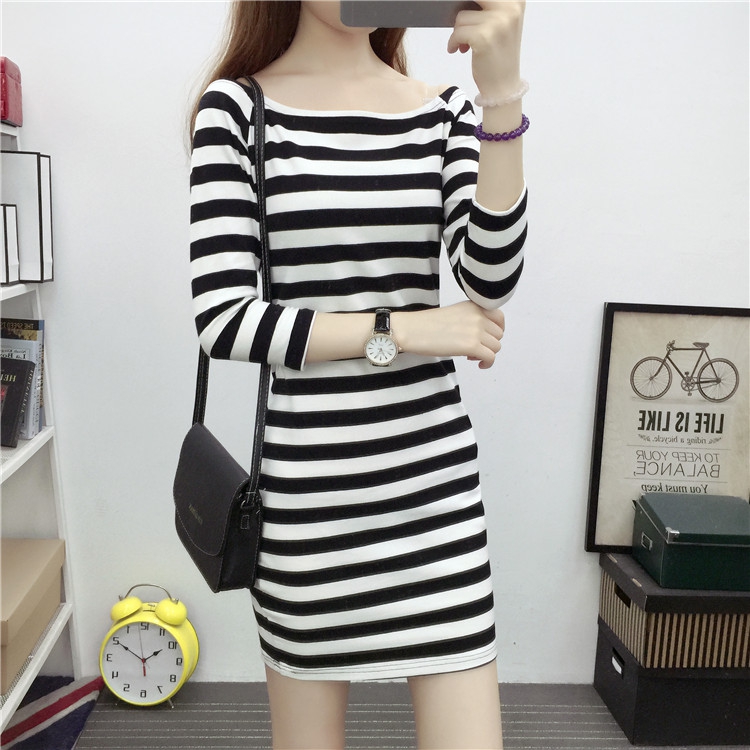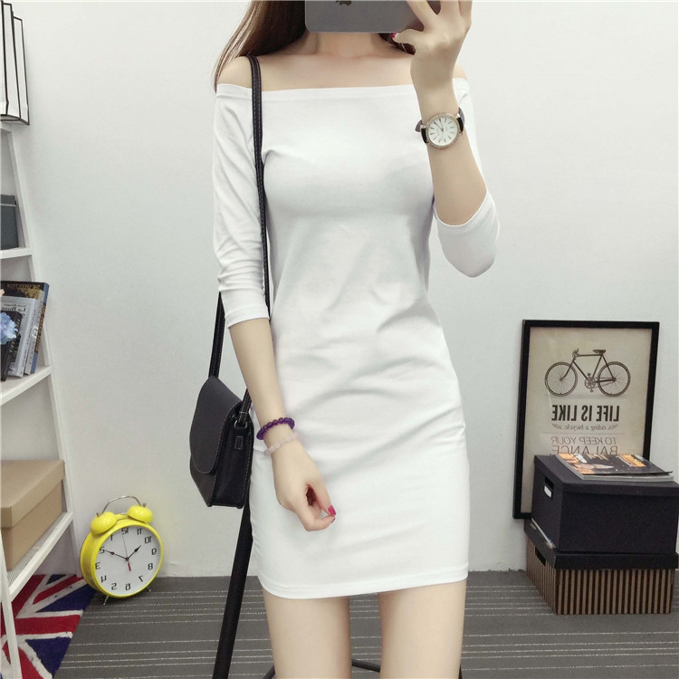 韩版春秋薄款棉质一字领中袖连衣裙性感露肩紧身包臀中长款打底裙
