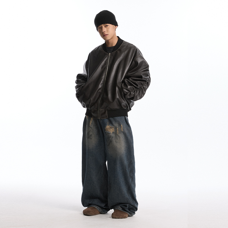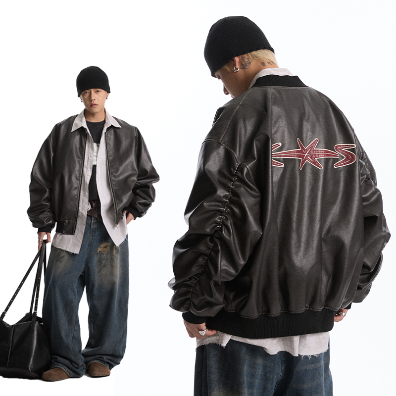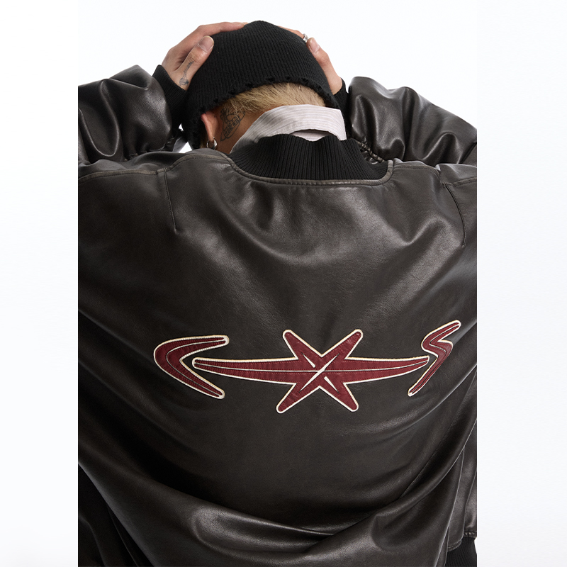 CoosRetro美式复古logo图案贴布绣擦色皮衣春季男女抽褶潮牌外套