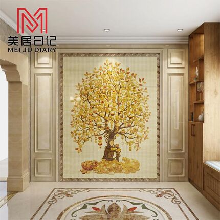 入户过道摇钱树发财板金钱树微晶石玄关瓷砖大理石彩雕背景墙欧式