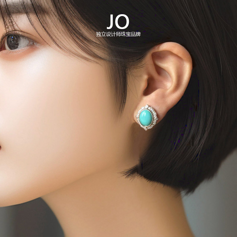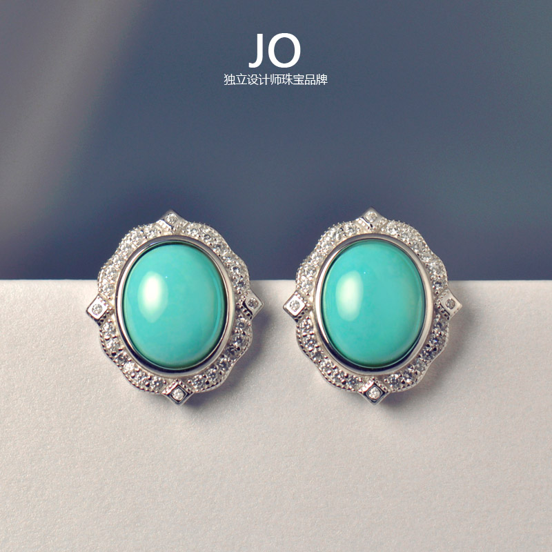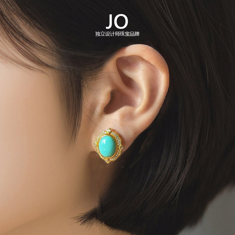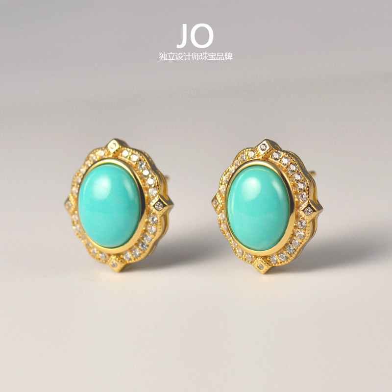 新款天然绿松石原矿美国蓝松高瓷高蓝女耳钉纯银镀金耳饰女友礼物