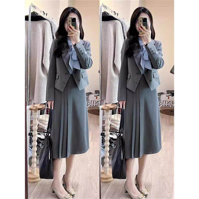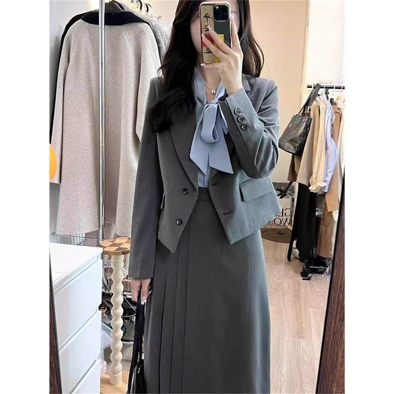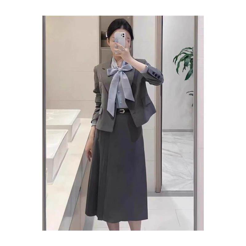 灰色西装套装女秋季新款小个子通勤面试正装休闲西服百褶裙两件套
