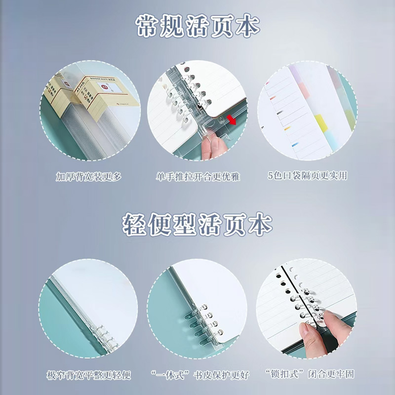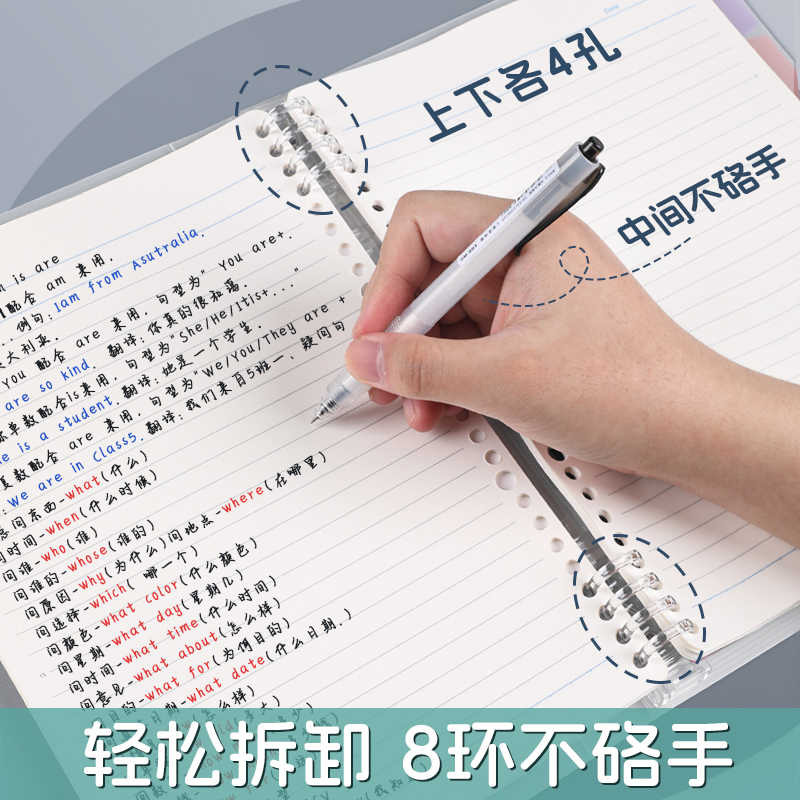 司马彦超顺滑速干不硌手8孔PP可拆卸活页本B5A5简约活页夹横线英语作文网格空白学生笔记本加厚活页替芯内页