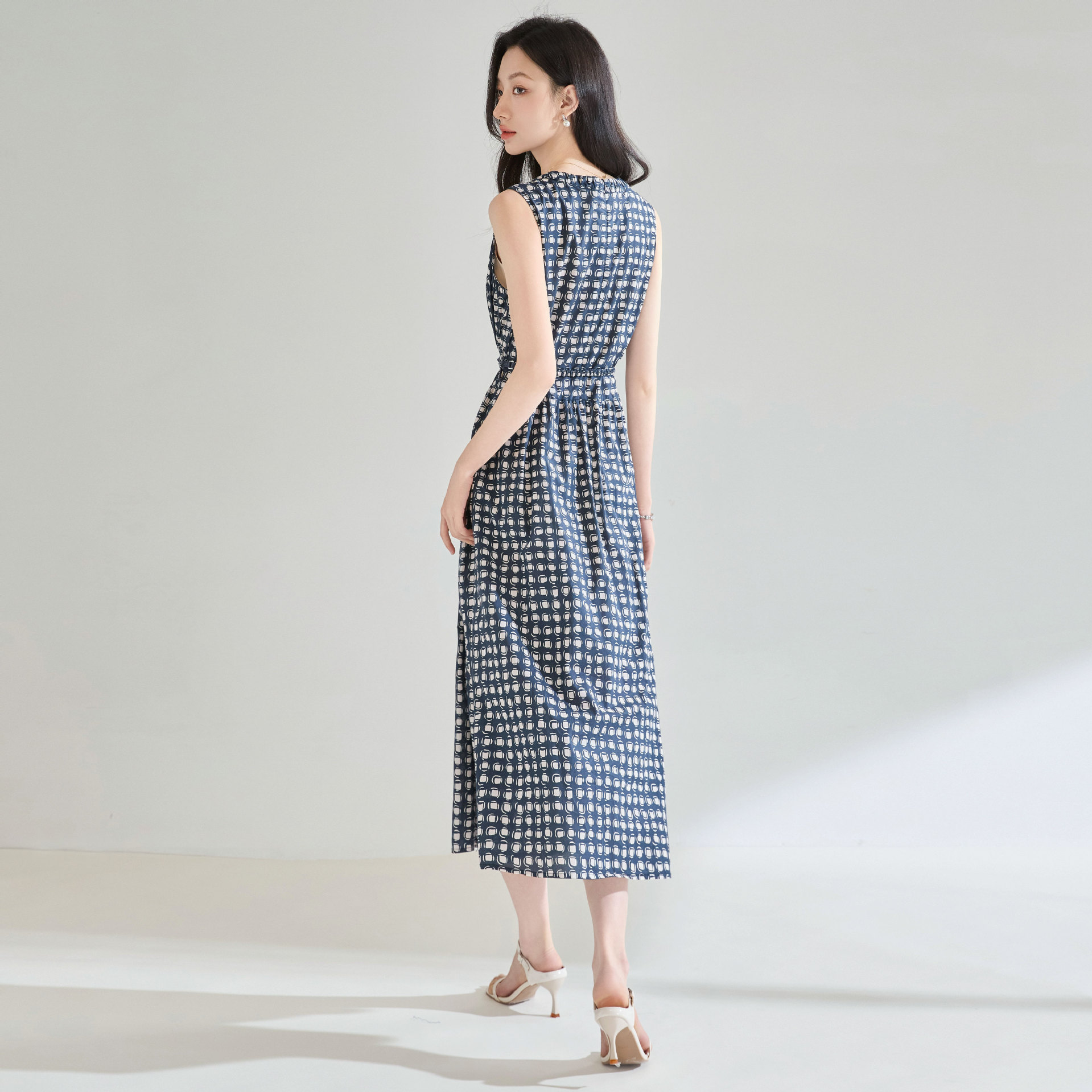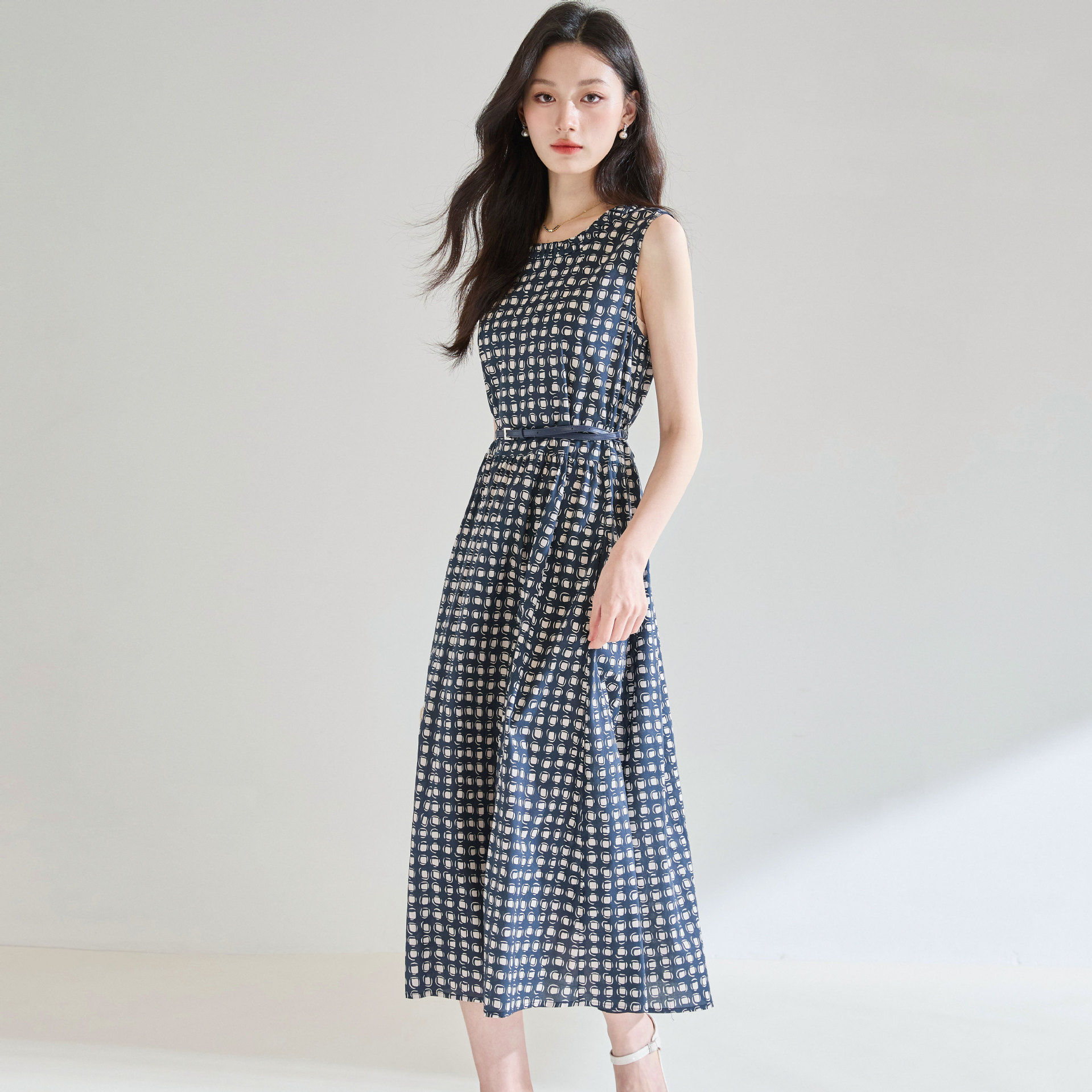 2025夏季新款纯棉格子印花收腰显瘦气质通勤简约长款无袖连衣裙女