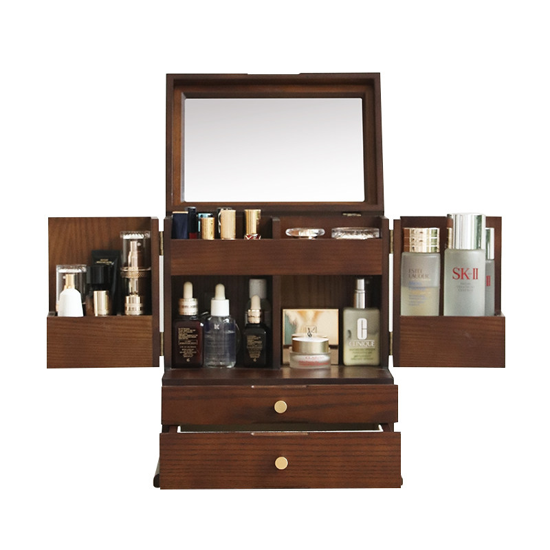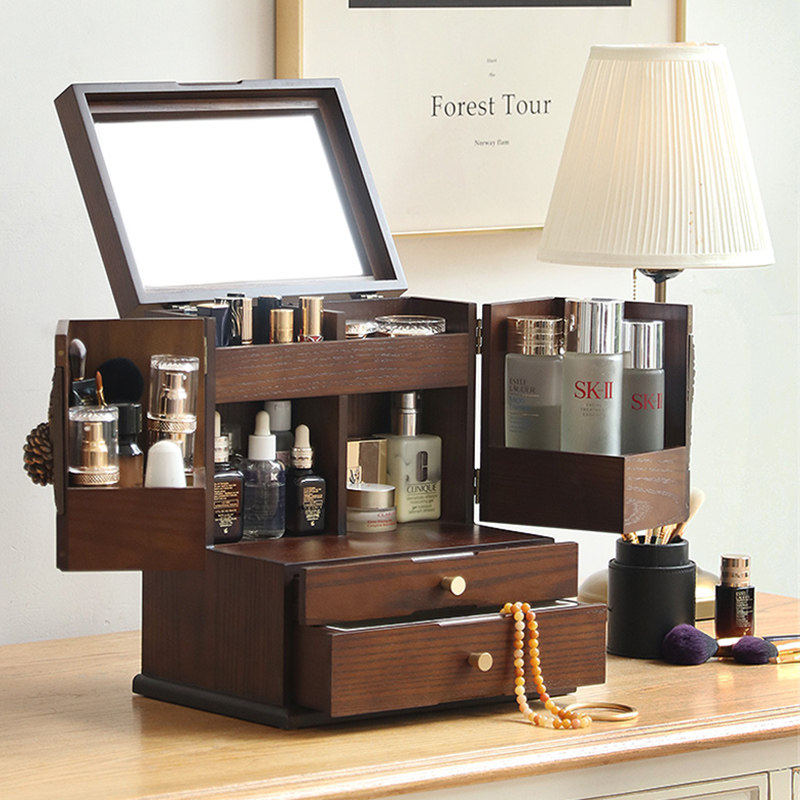 木质化妆品收纳盒首饰一体化妆盒防尘桌面梳妆台护肤品妆奁带镜子