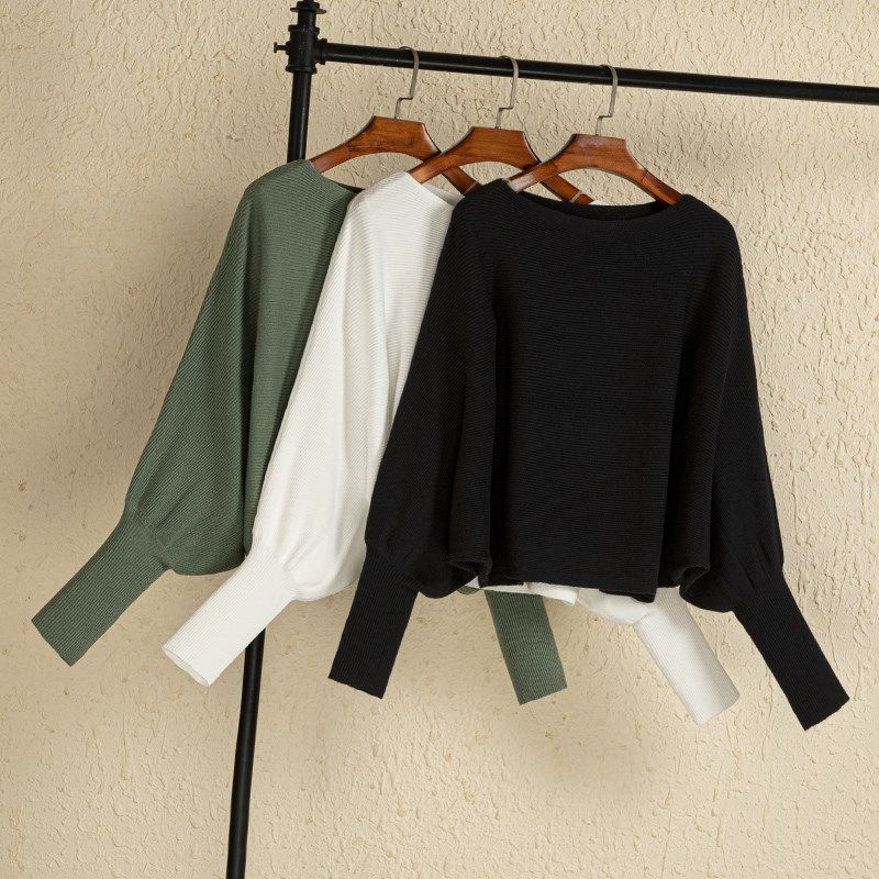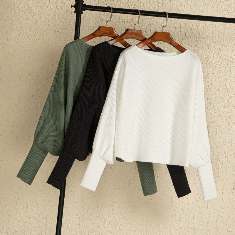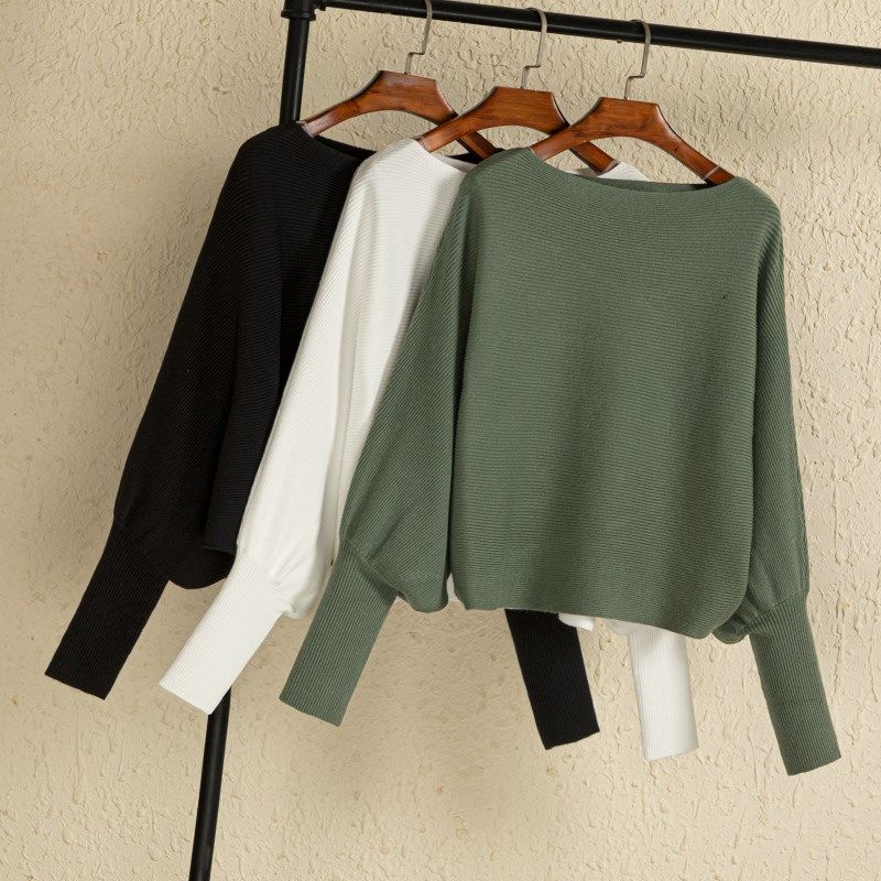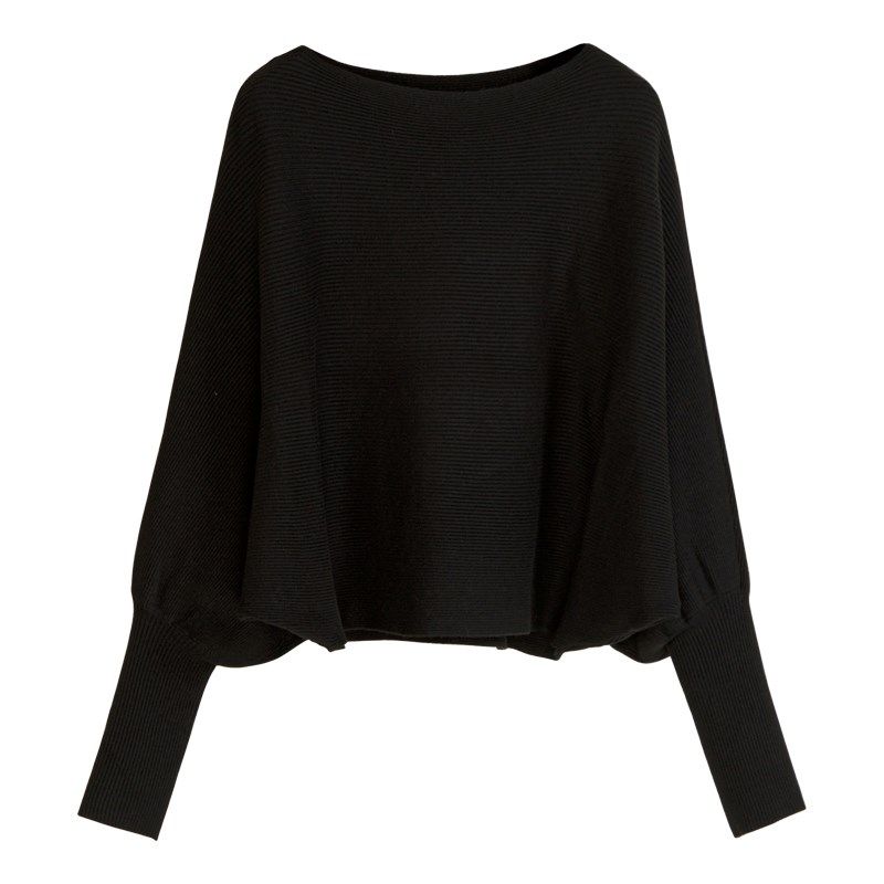 秋季黑色时尚款女式蝙蝠袖打底衫毛衣针织衫长袖短款宽松套头上衣