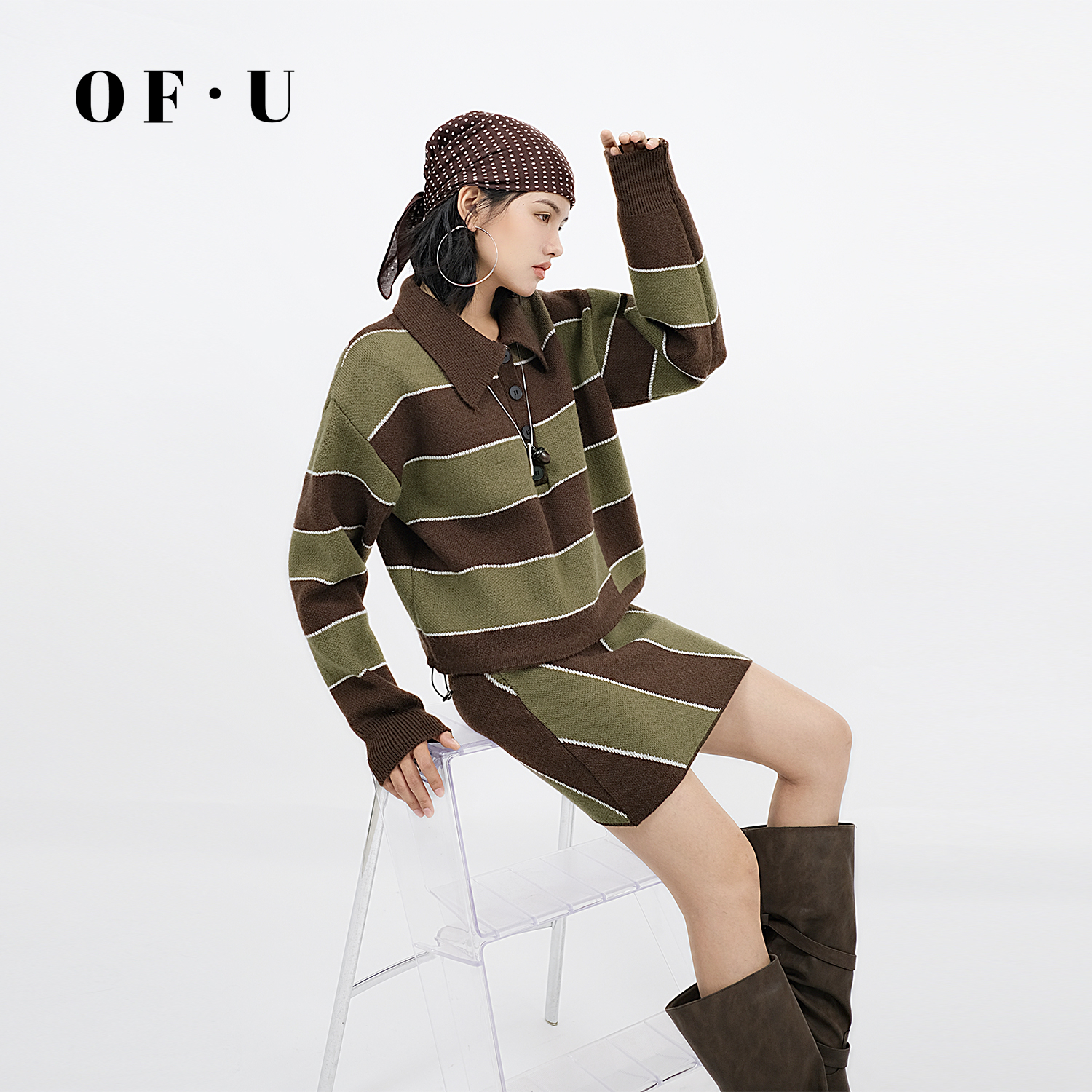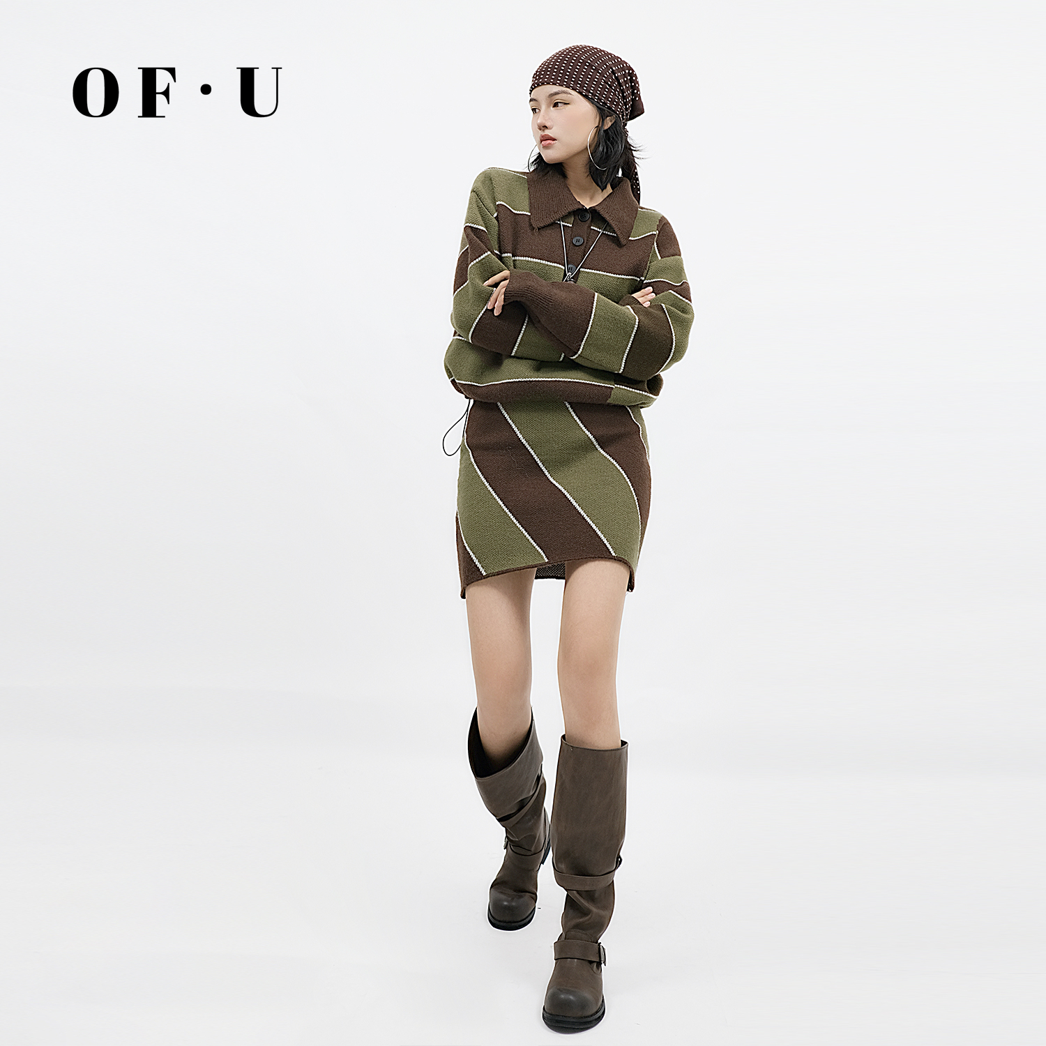 OF U咖色条纹翻领针织衫半身裙套装女秋冬宽松慵懒毛衣短裙两件套