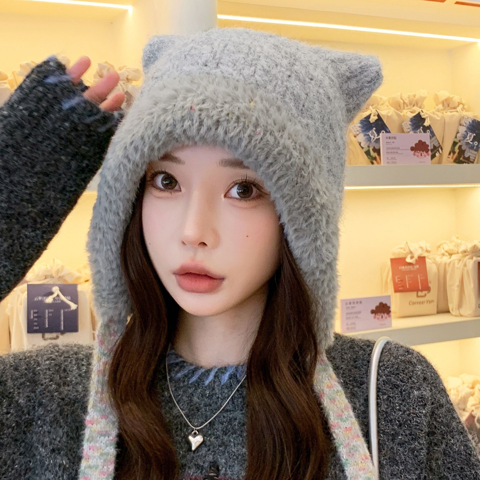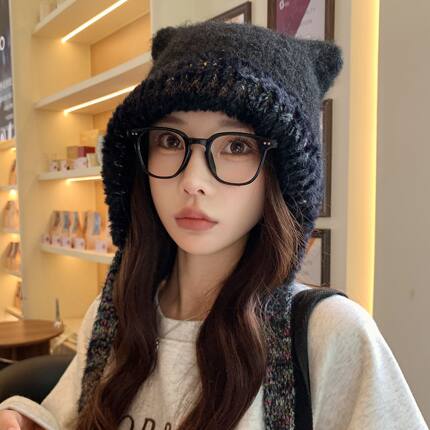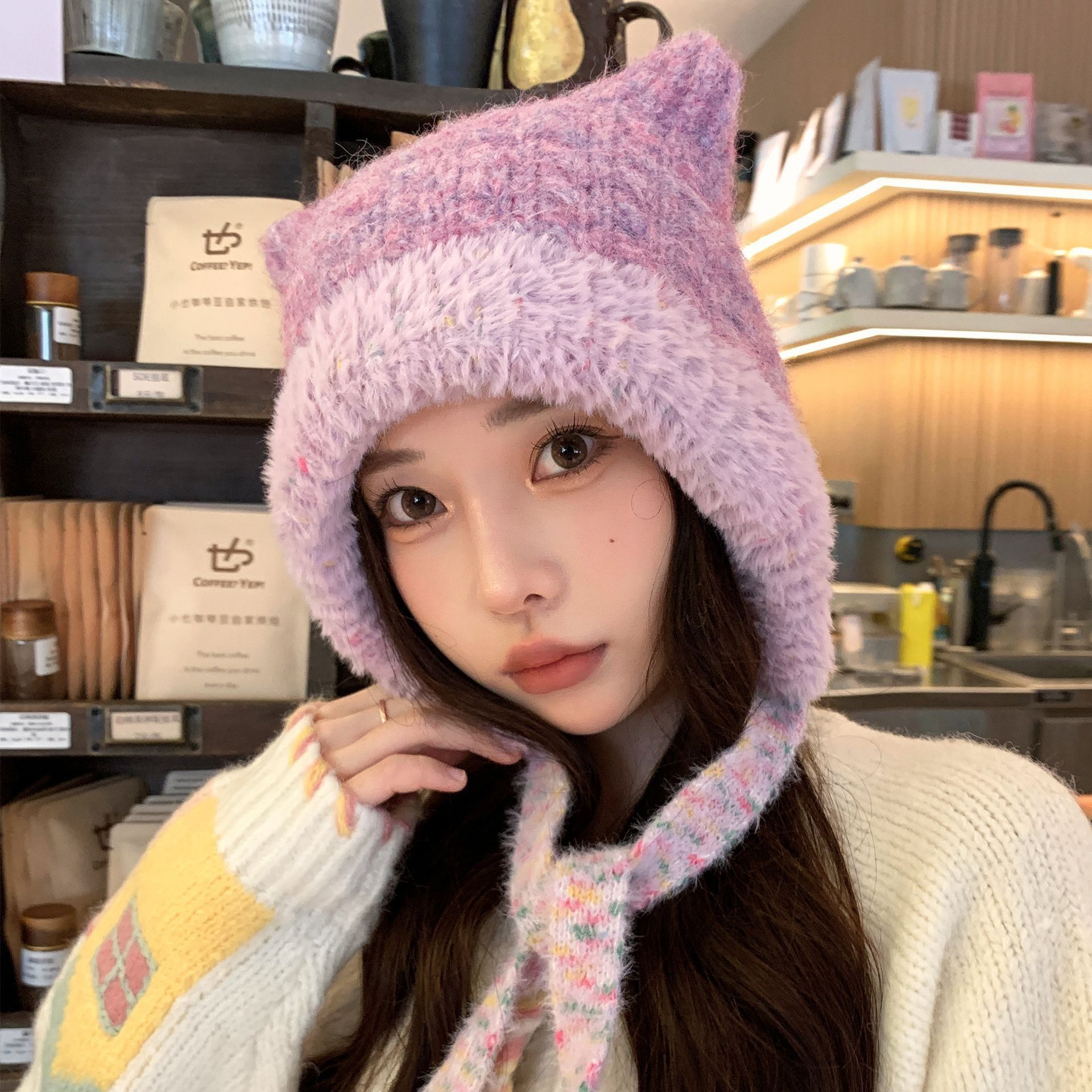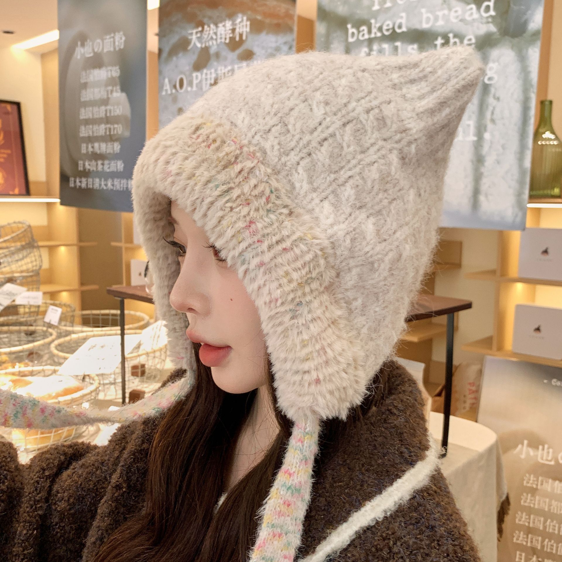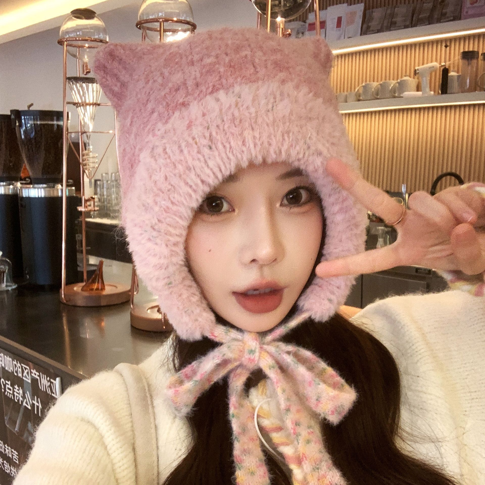 2025新款可爱小熊耳朵针织毛线帽女毛绒帽子秋冬季保暖护耳大头围
