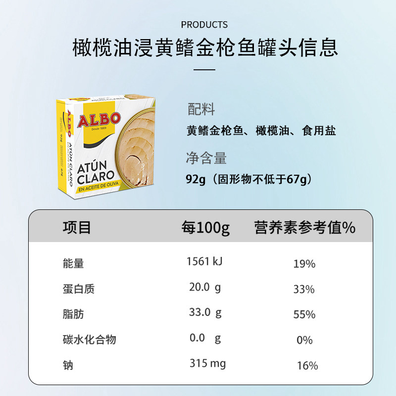 Albo即食橄榄油浸黄鳍金枪鱼罐头