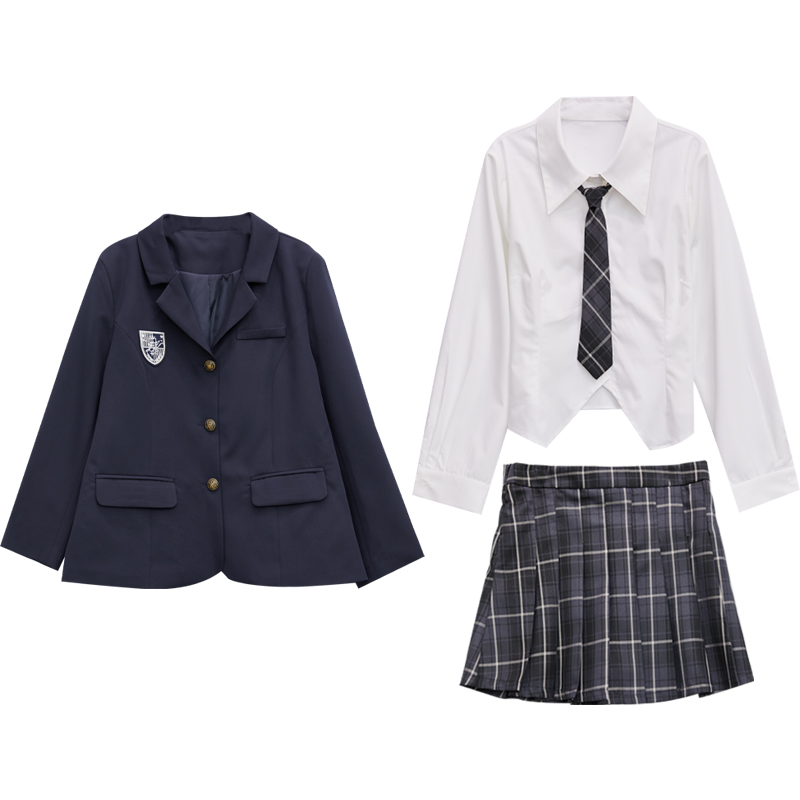 DM100大码百分百微胖mm女显瘦学院风小西装衬衫半身裙套装三件套