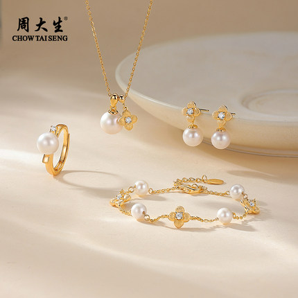 【所有女生38】周大生拉丝海棠纹珍珠项链耳钉手链戒指