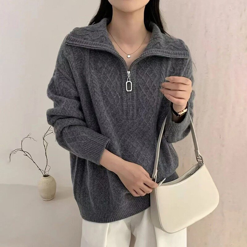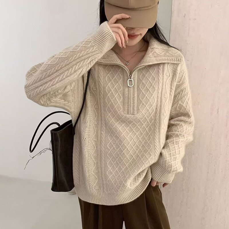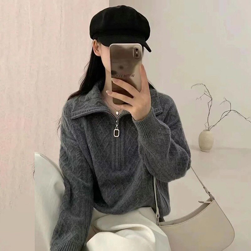 100%纯羊毛女慵懒风大翻领半拉链秋冬款套头羊绒打底针织毛衣