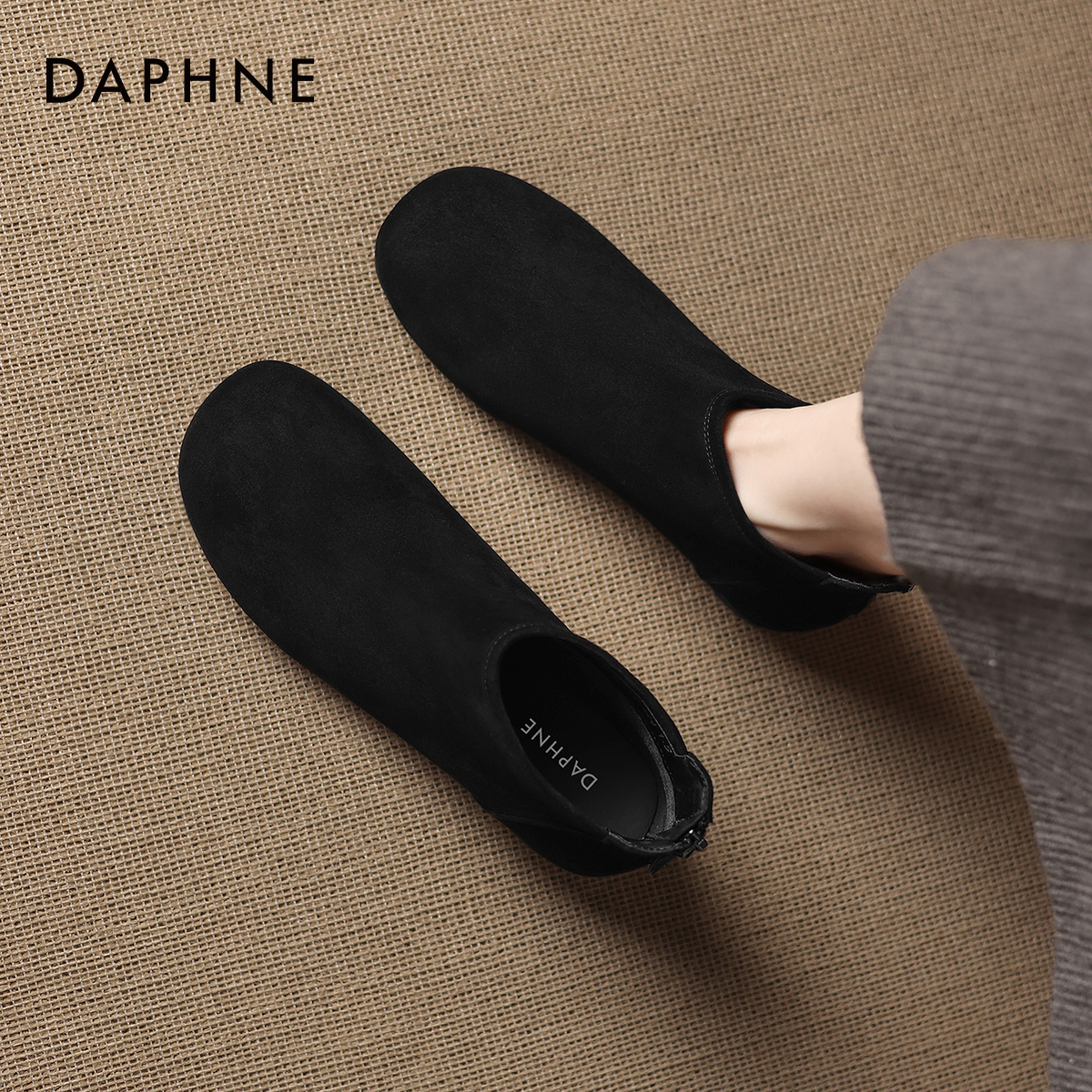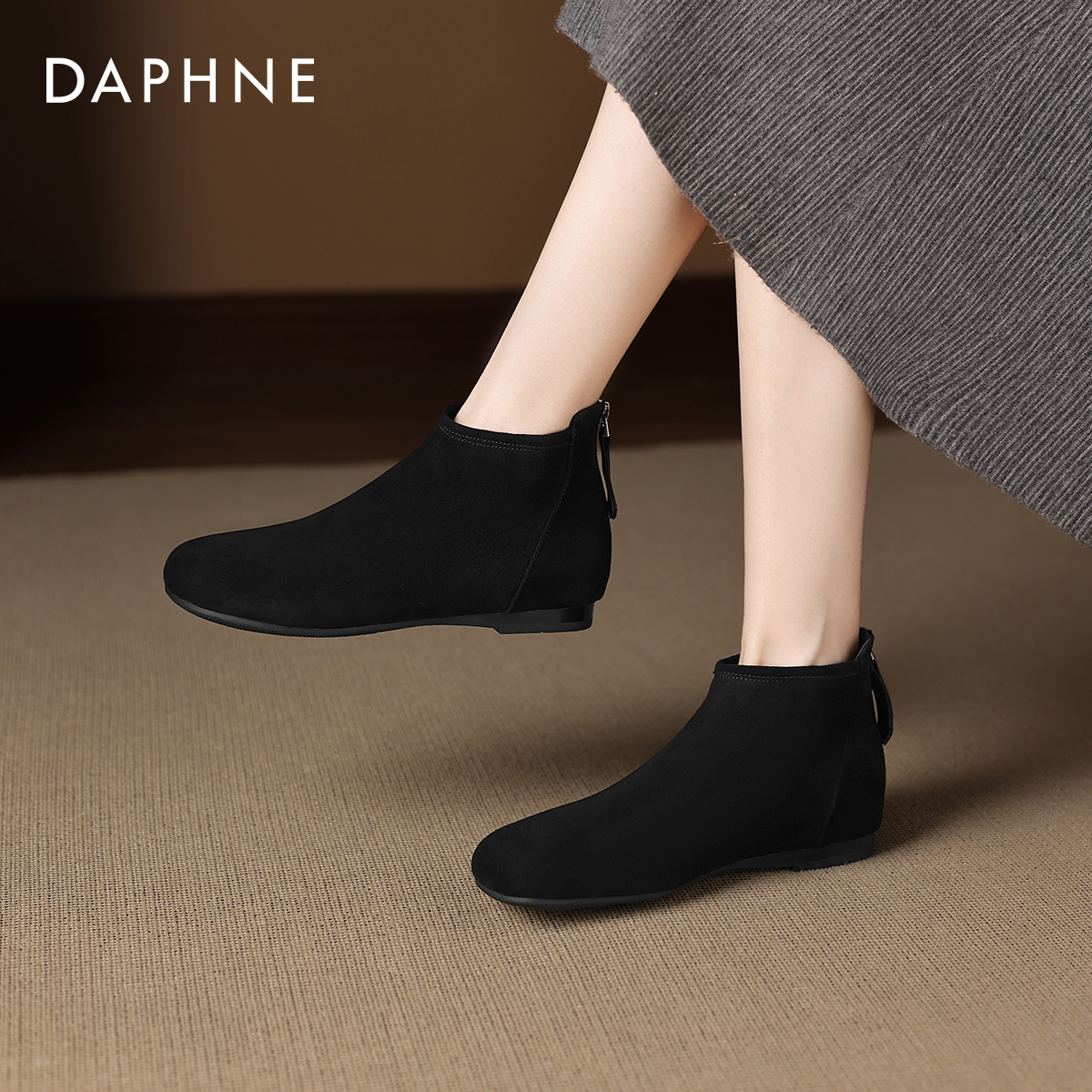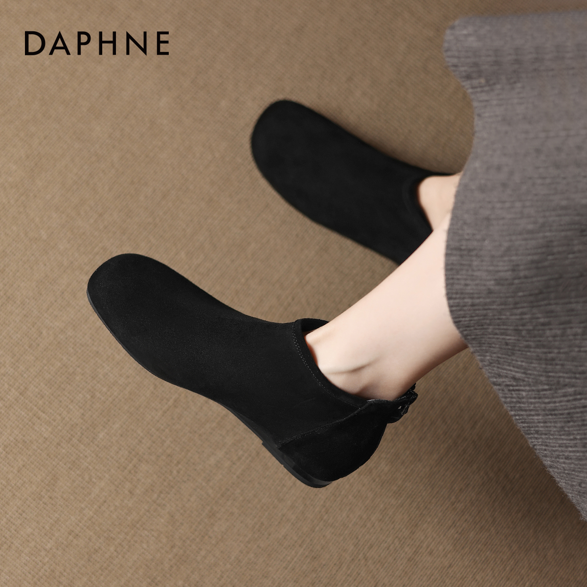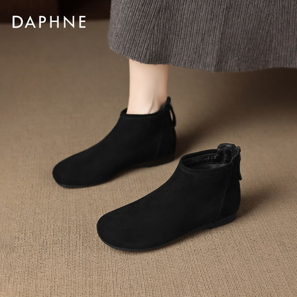 达芙妮黑色短靴平底圆头瘦瘦靴子