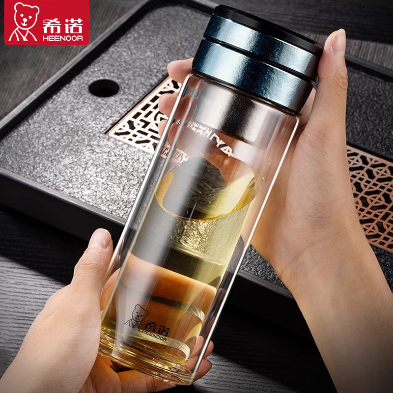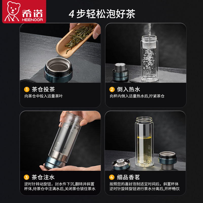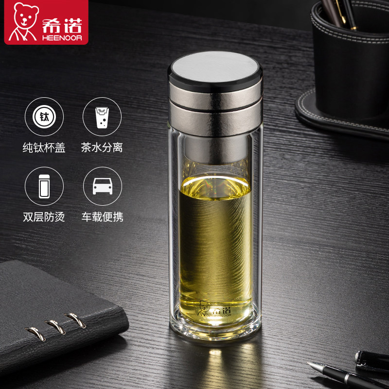 希诺双层玻璃杯纯钛茶水分离杯男士大容量水杯办公室高档泡茶杯子