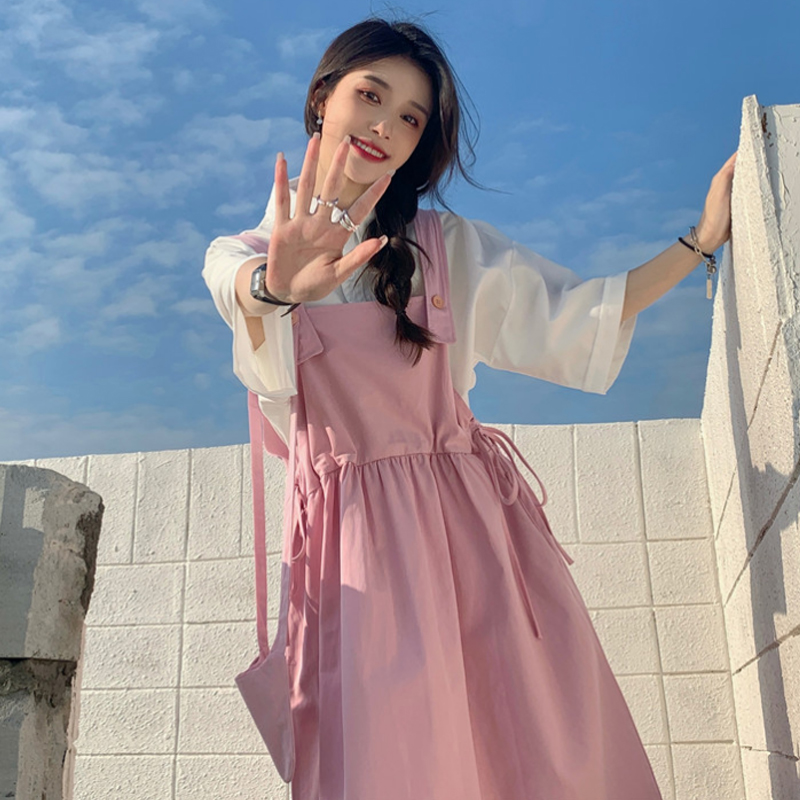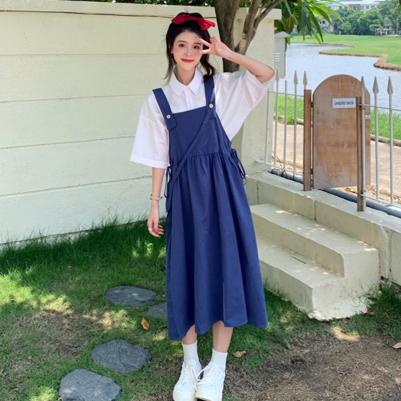 大码女装设计感时尚套装两件套夏装百搭衬衫+复古显瘦背带连衣裙