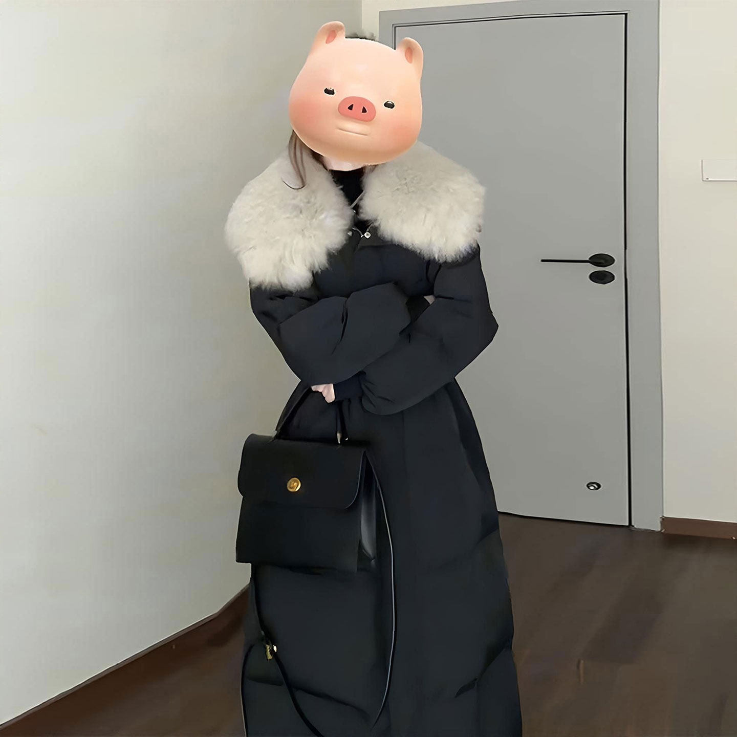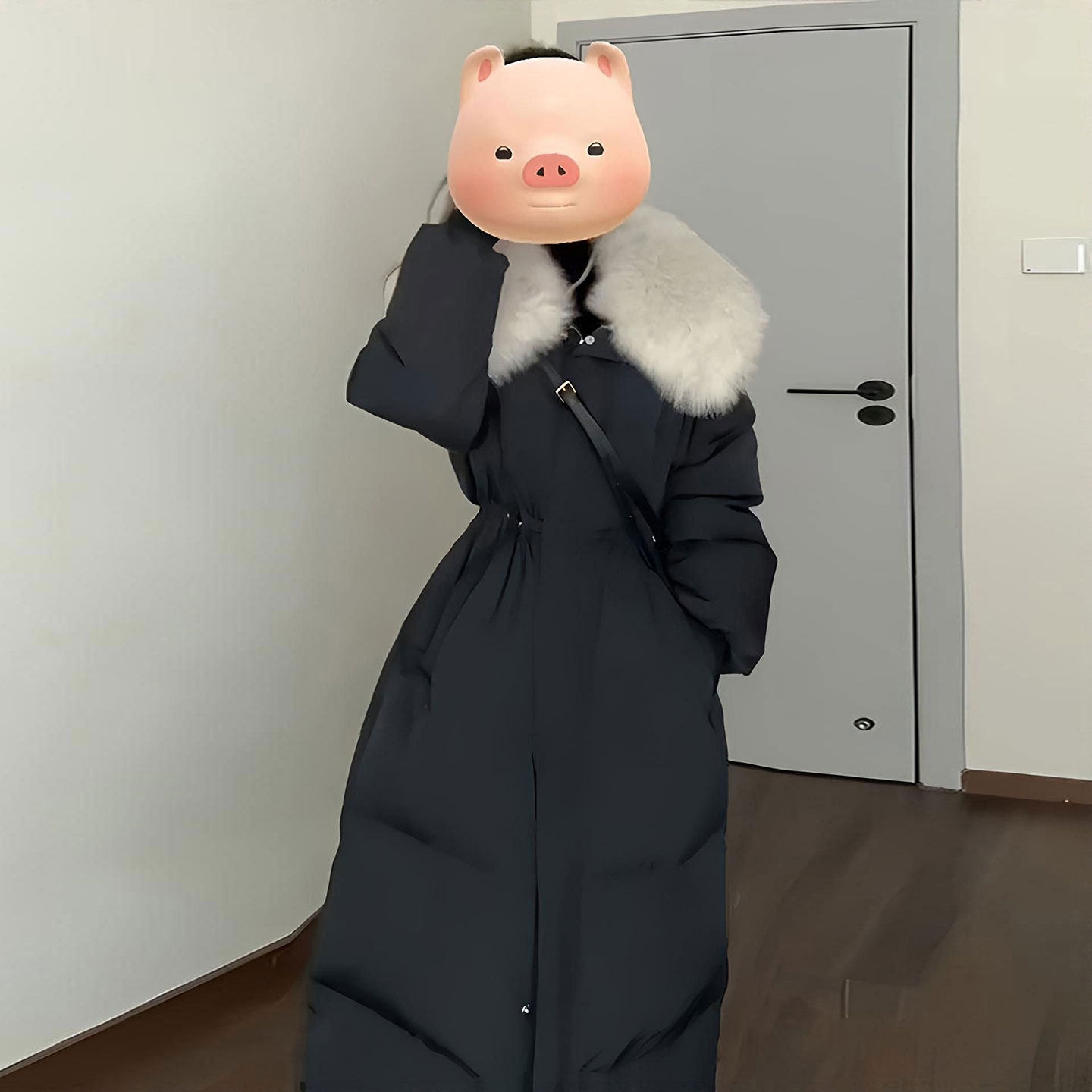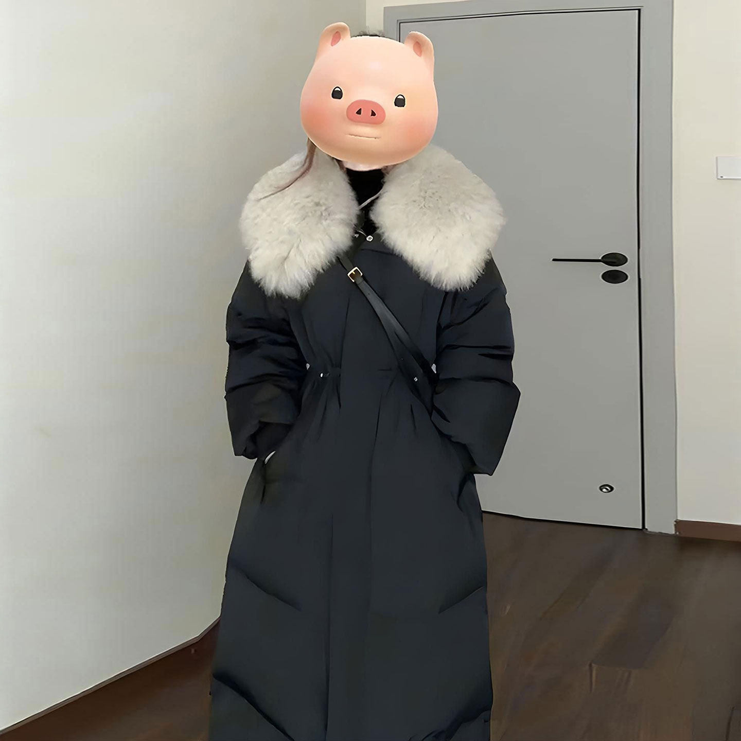 特大码胖mm收腰显瘦大毛领羽绒棉服女黑色加厚保暖中长款棉衣外套