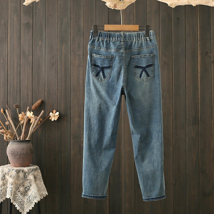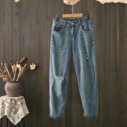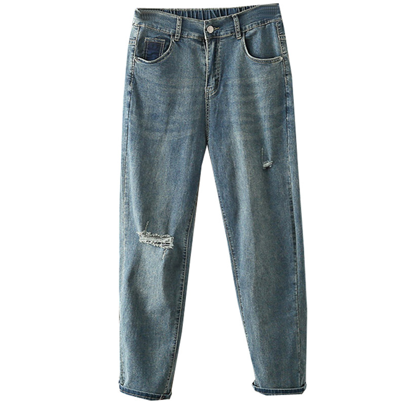 夏季大码200斤破洞牛仔裤女薄款哈伦裤胖mm显瘦九分老爹高腰裤子