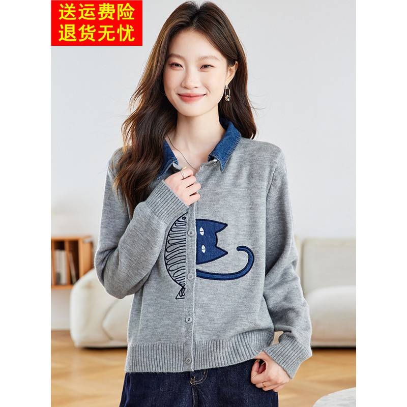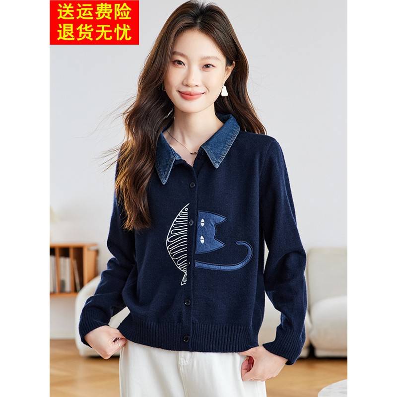 牛仔拼接衬衫领针织开衫女春秋2025新款翻领刺绣毛衣外套短款外搭