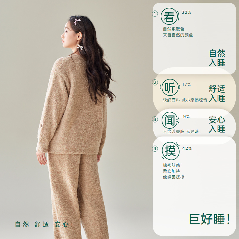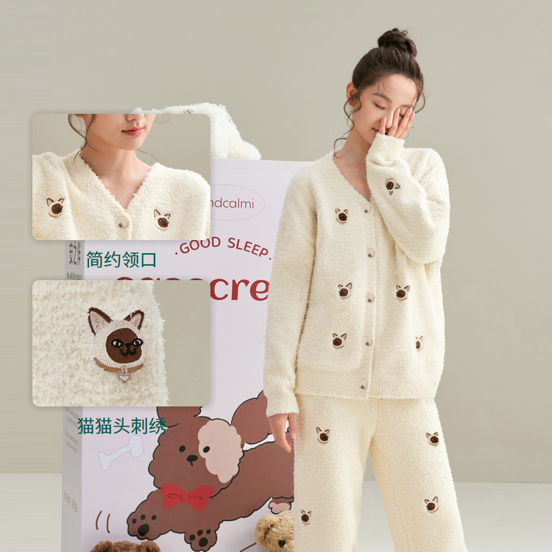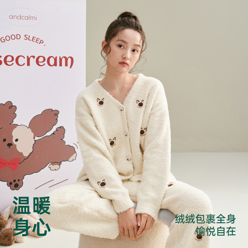 安之伴【巨保暖】半边绒睡衣女冬季刺绣v领加厚珊瑚绒家居服套装