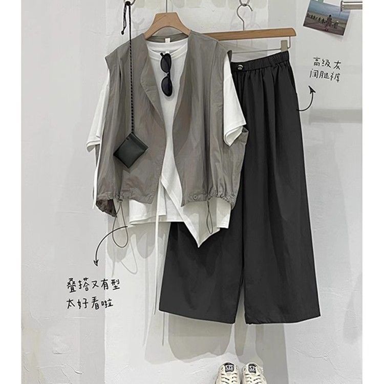 胖MM特大码300斤灰色抽绳马甲套装女夏季高腰遮肉阔腿裤两件套240