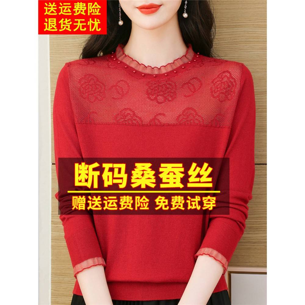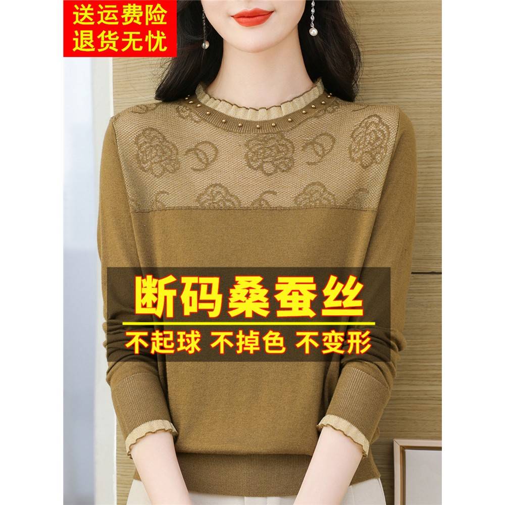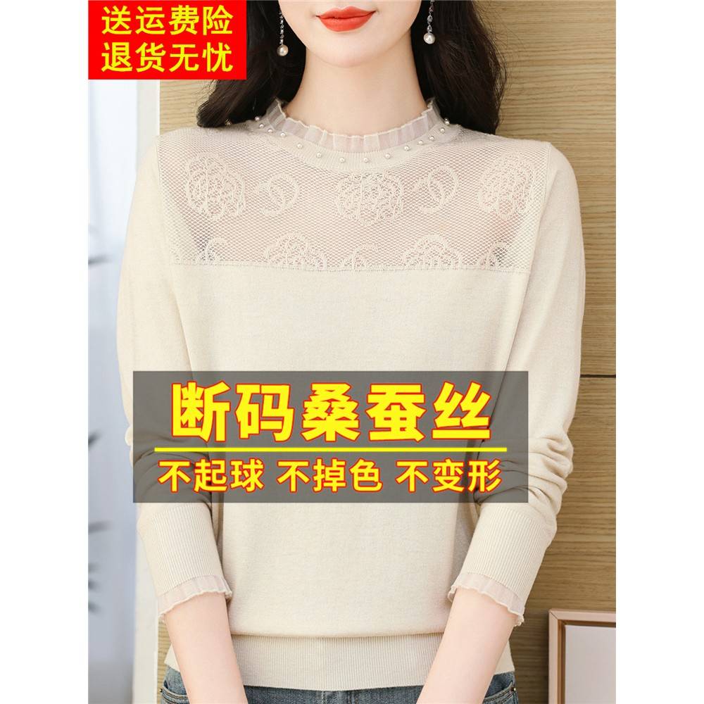 2025春装长袖t恤蕾丝网纱针织打底上衣妈妈漂亮桑蚕丝洋气小衫女