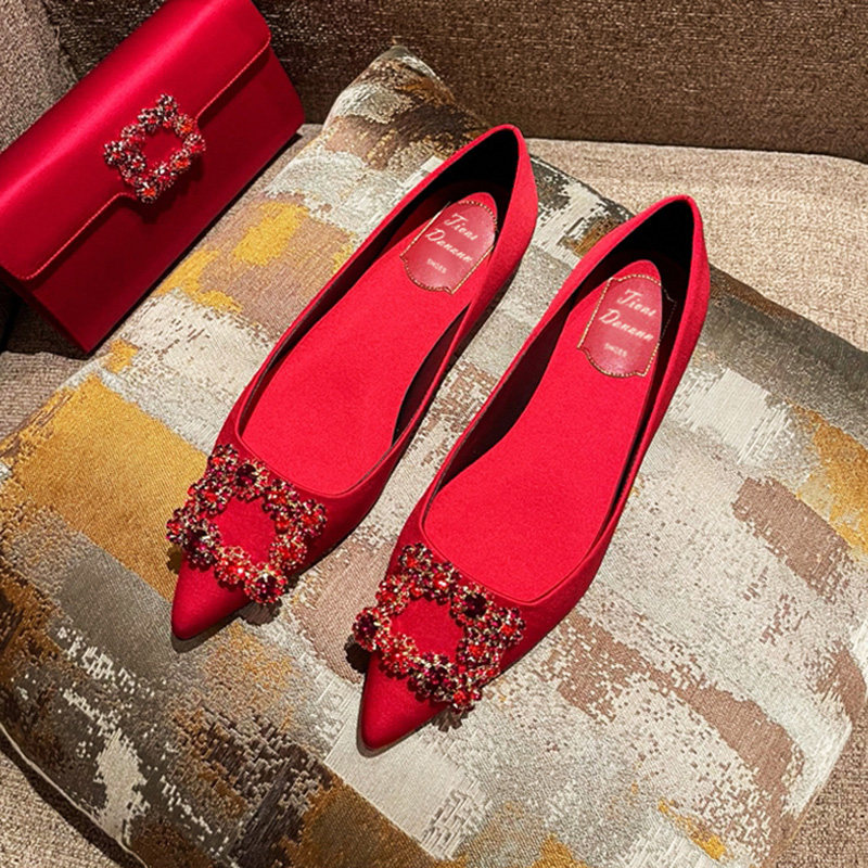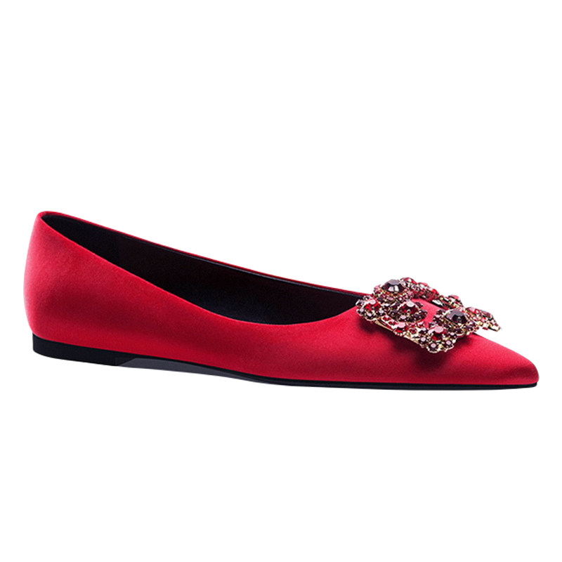 2025夏季新款红色真丝绸缎面水钻方扣平底鞋法式尖头单鞋子女婚鞋