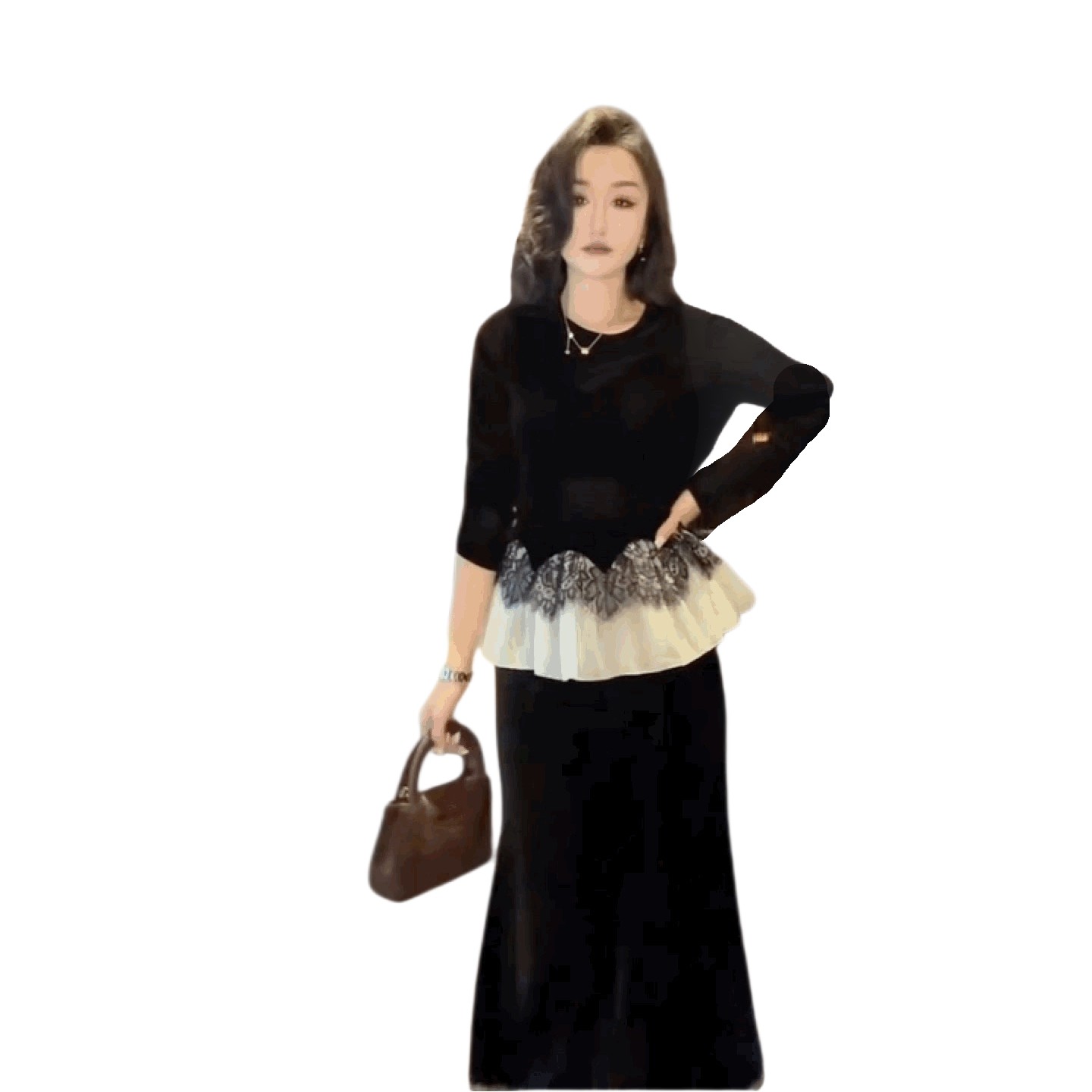 蕾丝雪纺拼丝绒T恤女法式金丝绒圆领黑色上衣荷叶边修身打底小衫