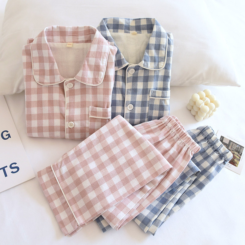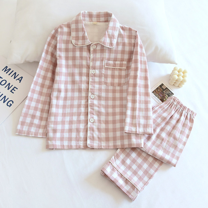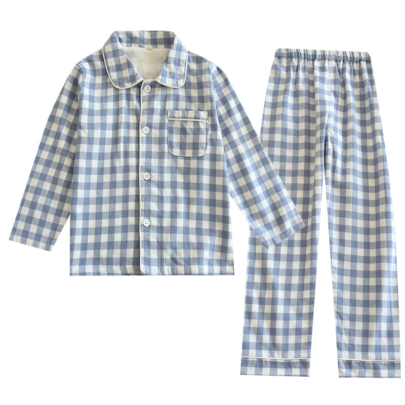 日式无印风格子睡衣儿童春秋纯棉磨毛绒布长袖男女童无侧缝家居服