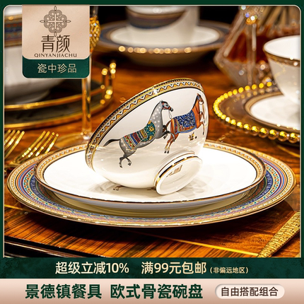 青颜双福马骨瓷碗盘景德镇餐具家用轻奢陶瓷饭碗菜盘碟子汤碗面碗