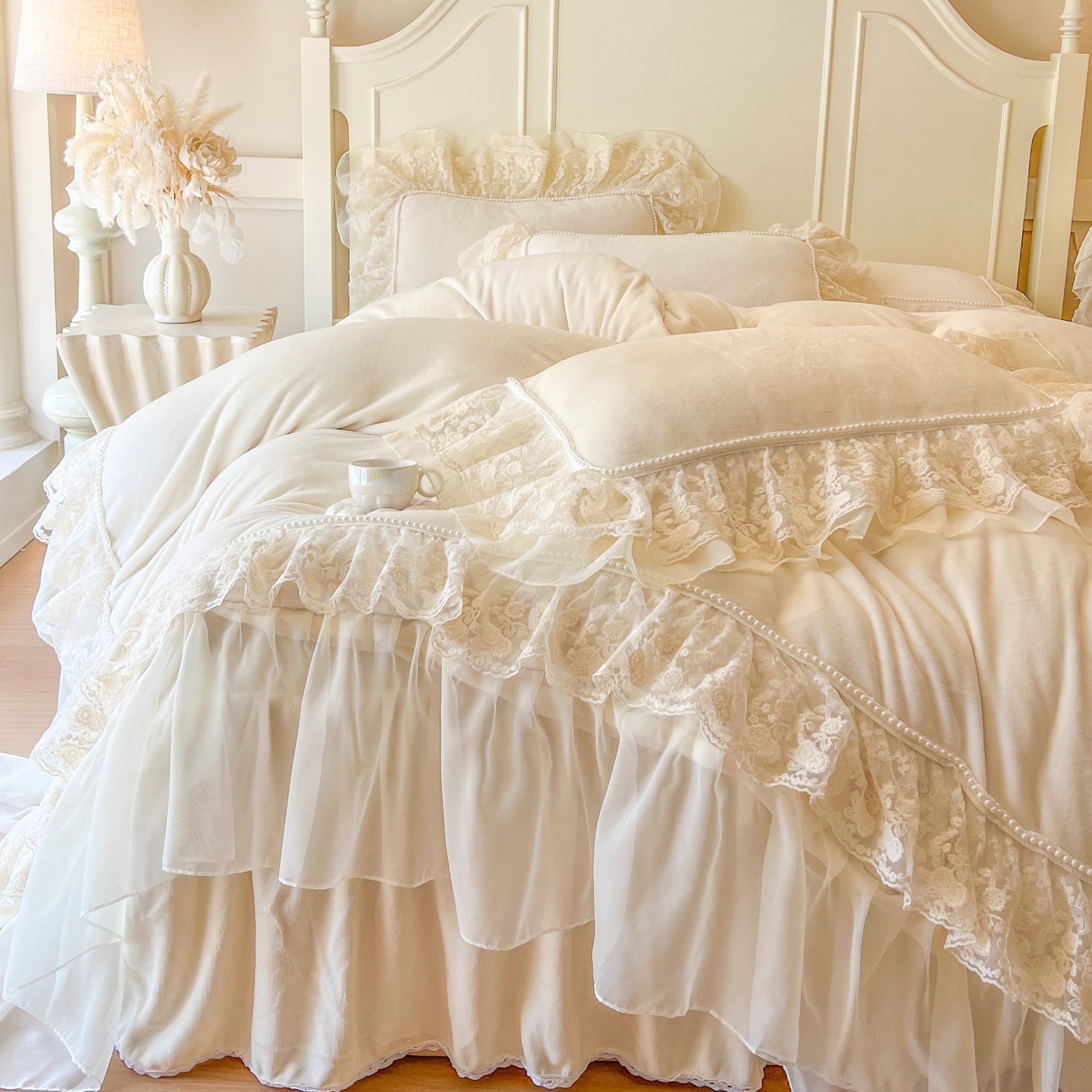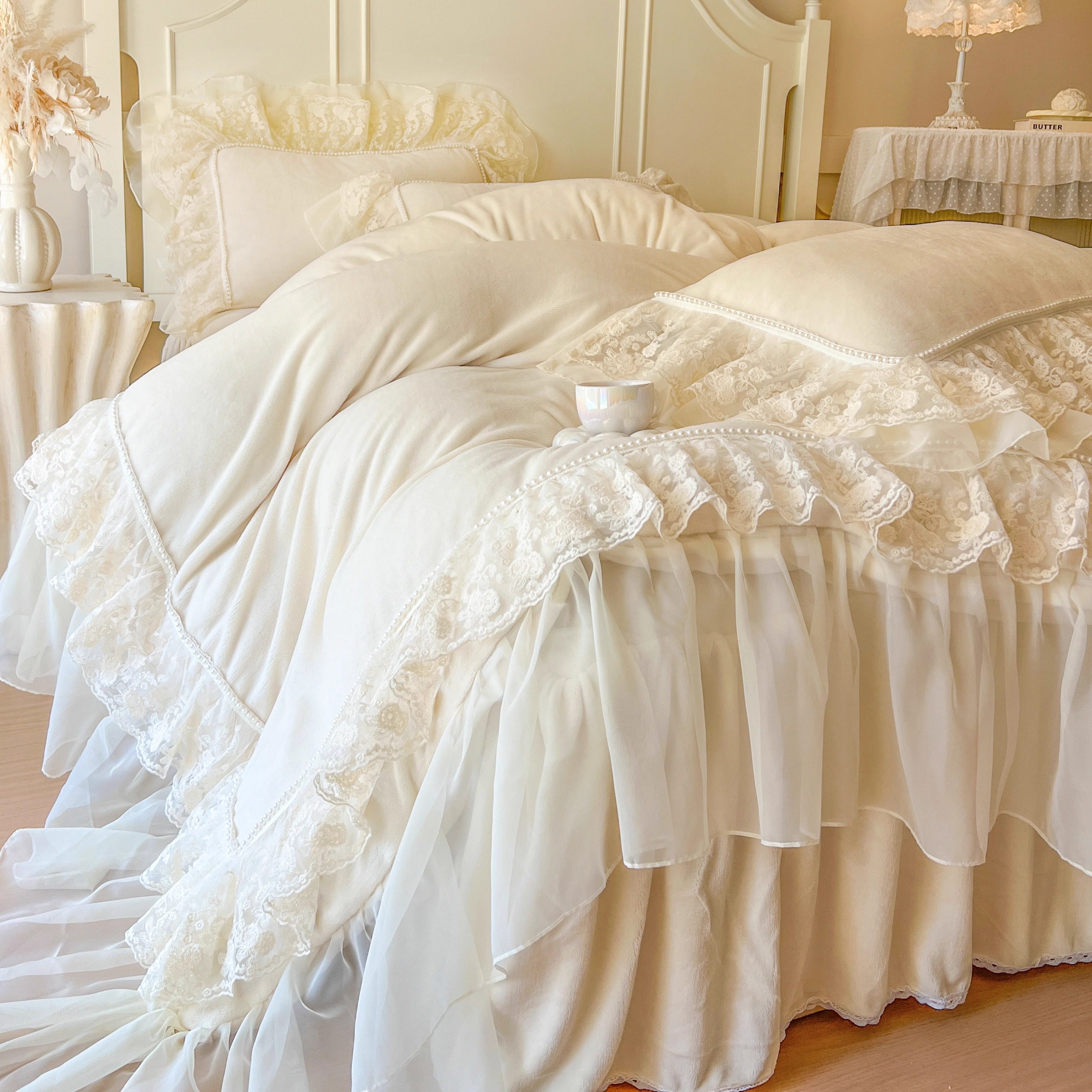 冬季法式加厚牛奶绒床上四件套公主风蕾丝花边珊瑚绒被套仙女床裙