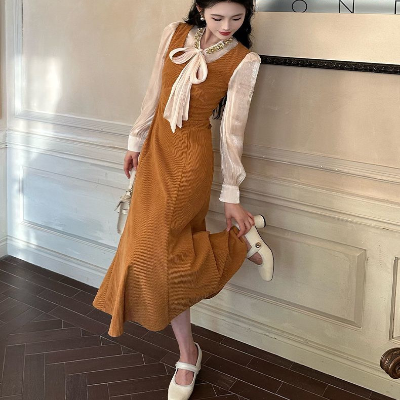 法式复古灯芯绒连衣裙女2025秋季新款长袖衬衫气质假两件鱼尾长裙