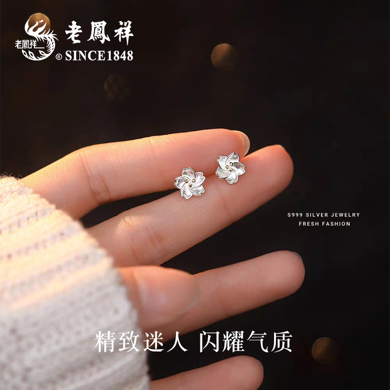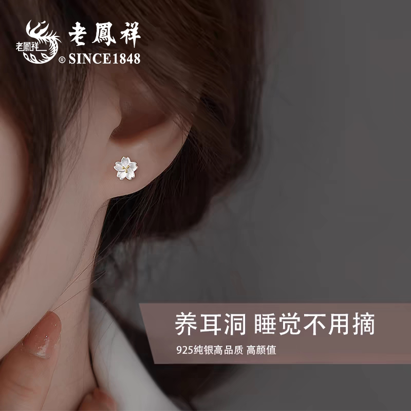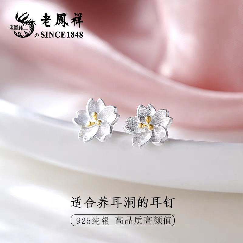 老凤祥s925银桃花耳钉高级足银养耳洞耳饰纯银耳棒生日礼物送女友