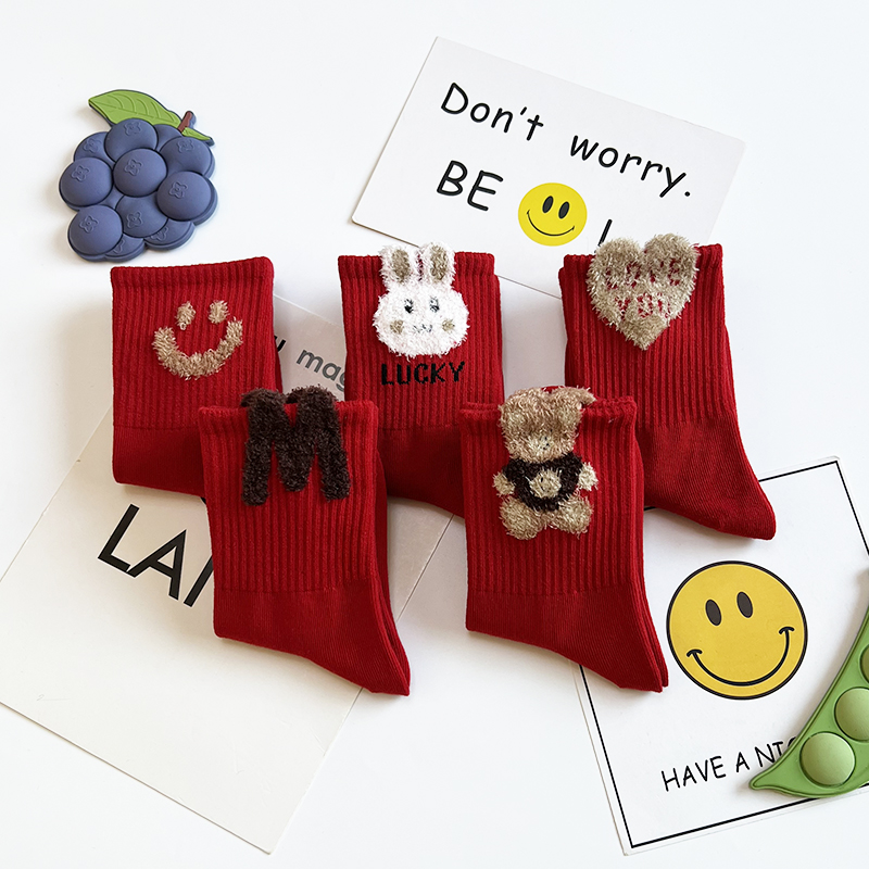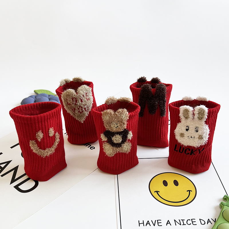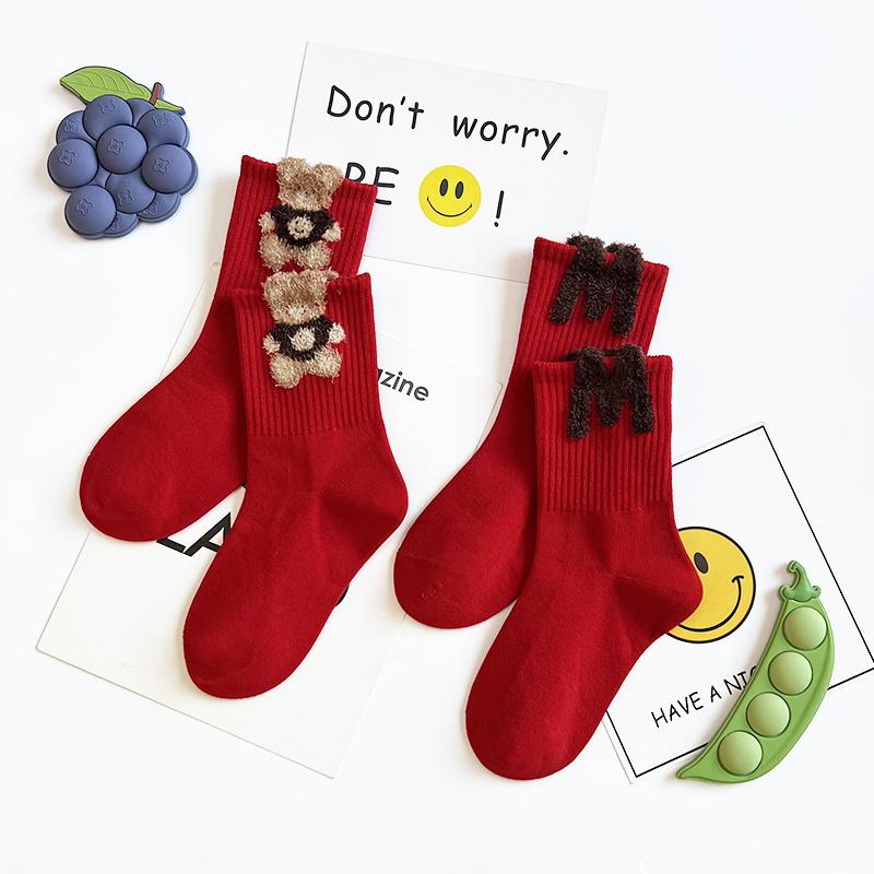 儿童红袜子秋冬季精梳棉卡通可爱本命年男女童学生运动中高筒潮袜
