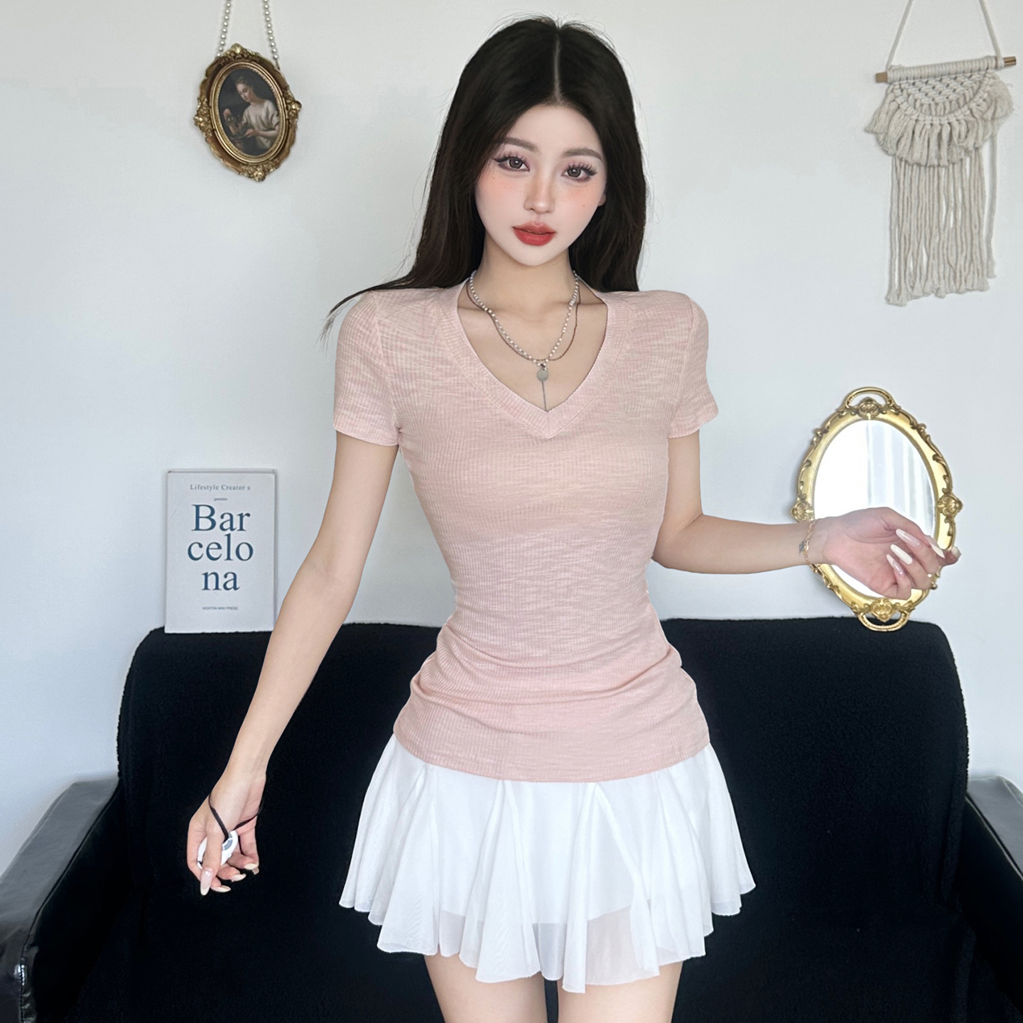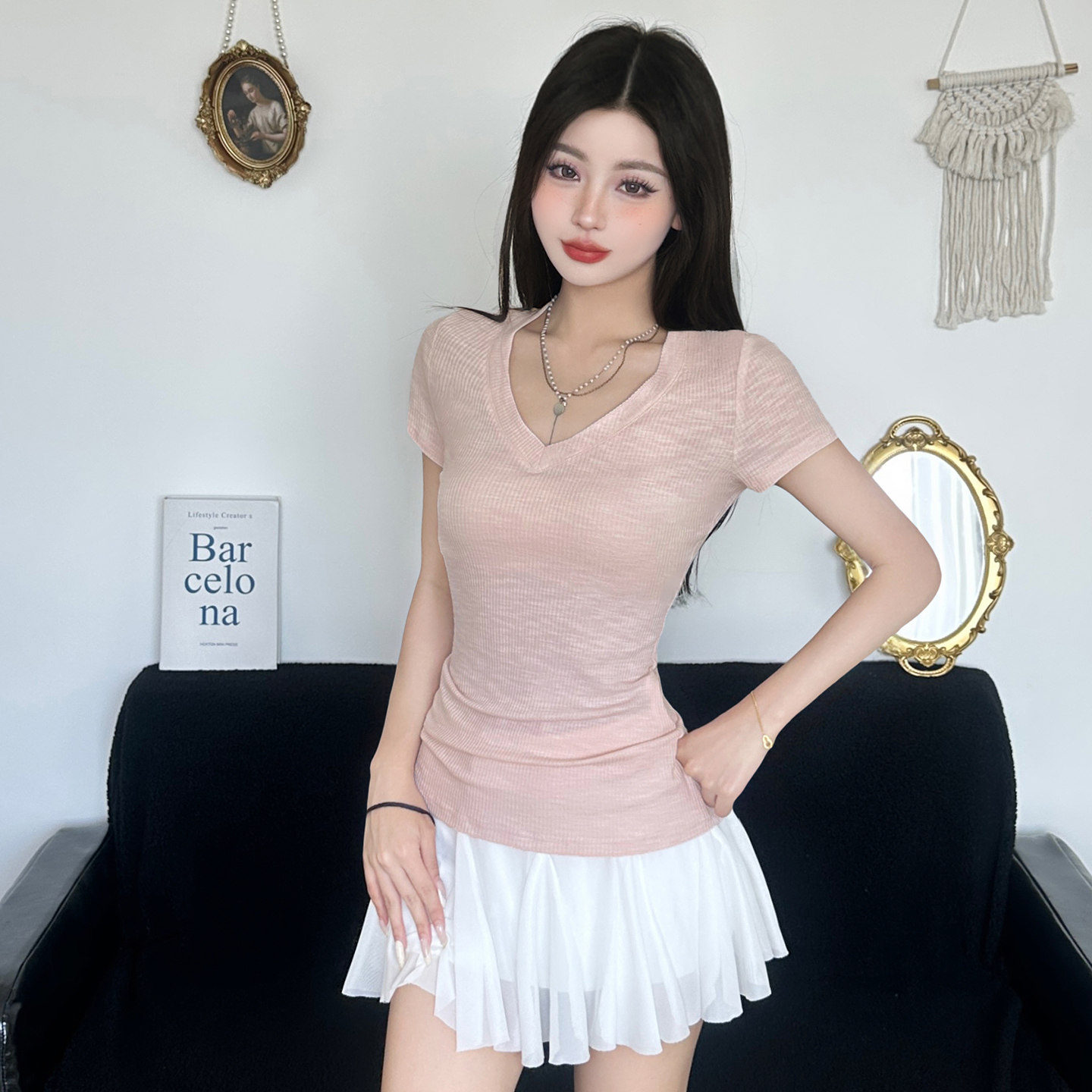 Amyway【纯欲简约】甜辣性感少女风V领短袖T恤女修身显瘦百搭上衣