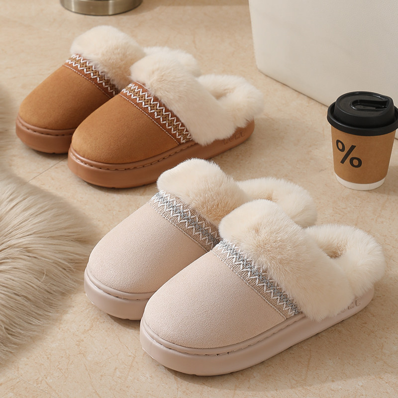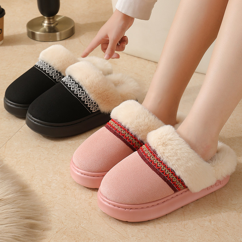 新款秋冬季花边民族风时尚棉拖鞋男女情侣款室内保暖防滑棉拖鞋