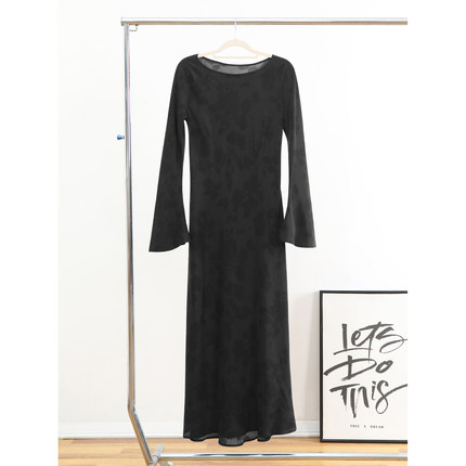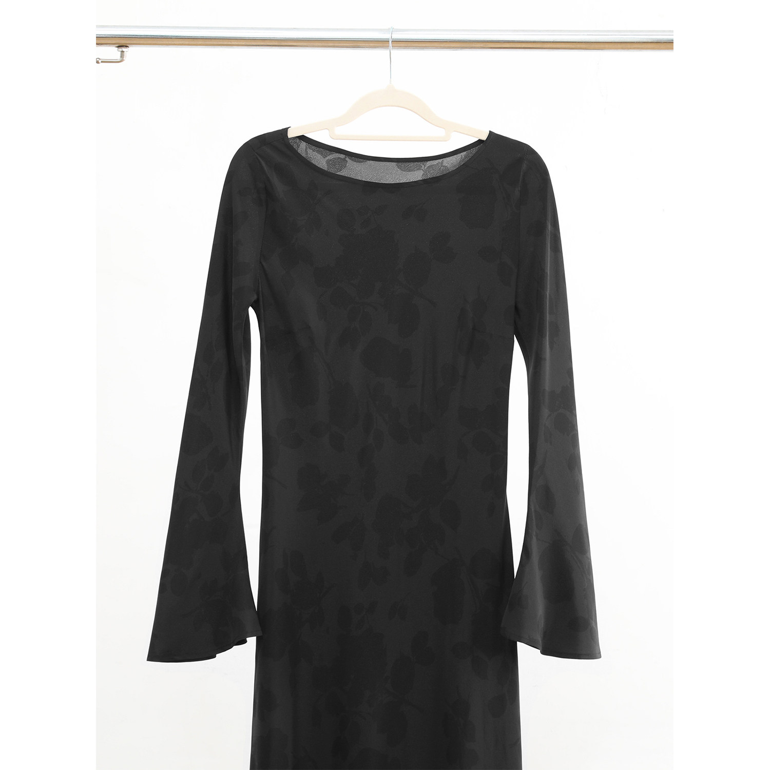 100%桑蚕丝复古真丝印花03双绉收腰修身显瘦喇叭袖长款连衣裙女