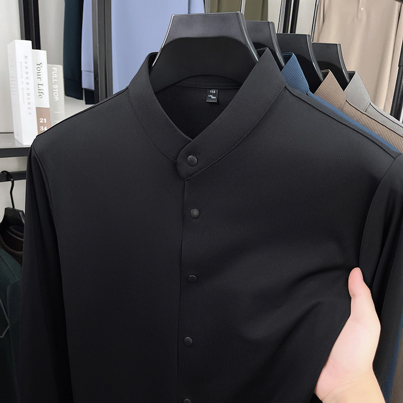 皮尔卡丹春秋新款立领长袖衬衫男士纯色中国风无痕衬衣中年男装